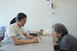相 川: 私は、言語聴覚士(ST)として、経管栄養の利用者様の摂食嚥下訓練を行なっています。 「食べる」という認識がない方にはまず「食べる」ことを思い出すことが大切です。 そのため、STが食べているところを見せます。 利用者様と一緒に棒付き飴や赤ちゃんせんべいを食べながら訓練を行ないます。 最終的に口から食事が摂れるようになり「おいしいね」との言葉や笑顔がみられた時は、 この仕事をやっていて良かったと感じます。