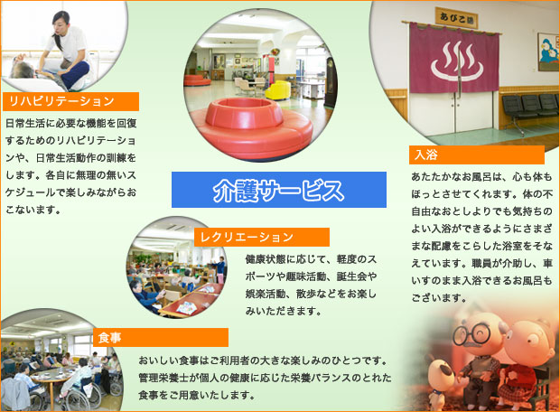 入浴(生活サービス)、食事(栄養指導)、リハビリテーション、レクリエーションのサービスをご提供します。