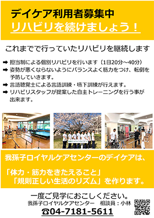 私たちの施設から退所された利用様には、リハビリの継続の為、通所リハビリテーションをすすめてきました。