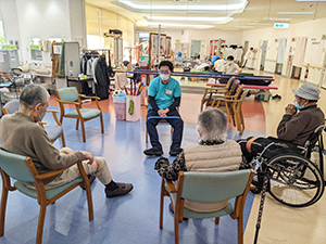 集団リハビリにて、手・足・お腹周りの衰えやすい筋肉を強化し、姿勢が良くなることを意識した運動を実施しています。
