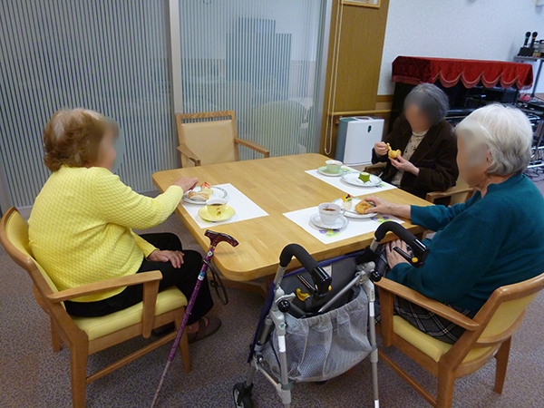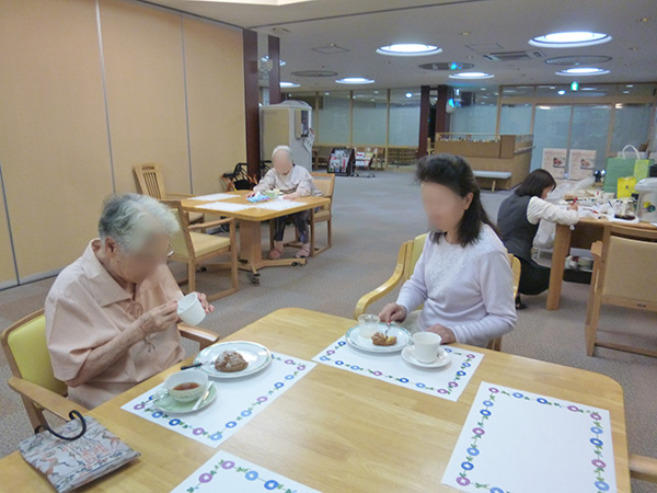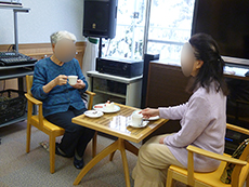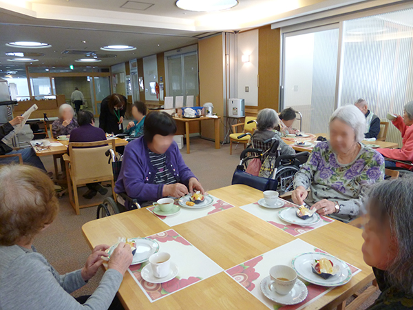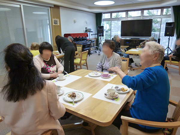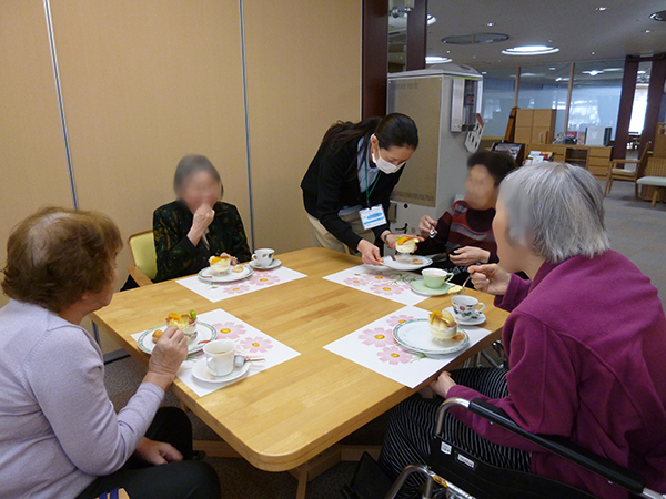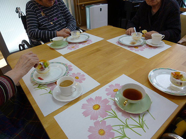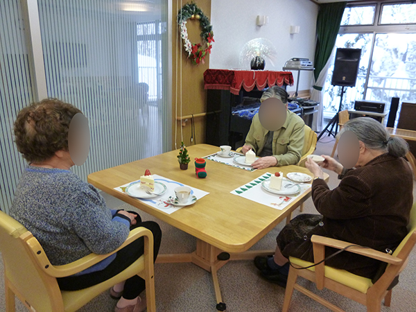 喫茶アイムスの開店日には雪もちらちらと降り、窓越しに雪景色を楽しみながら、入居者さまには美味しいケーキと紅茶を楽しんでいただきました。