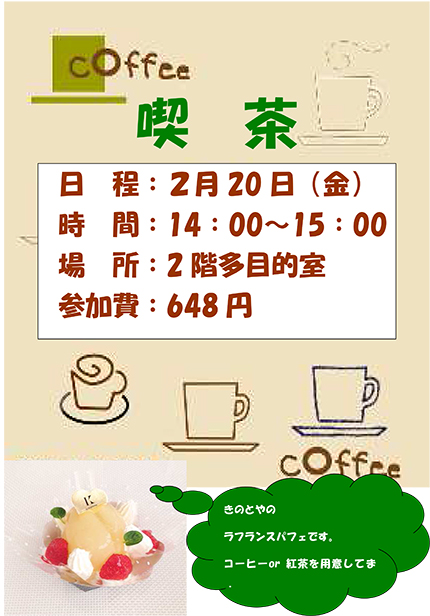 ■フラワーサークル 2015.03.31 ■『いきいきビューティーサロン』(要介護者) 2015.03.26 ■喫茶アイムス 2015.03.20 今月の喫茶アイムスは札幌では有名な洋菓子屋『パールモンドール』のプチケーキとコーヒーのセットです。