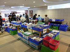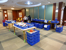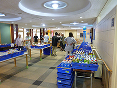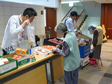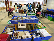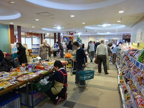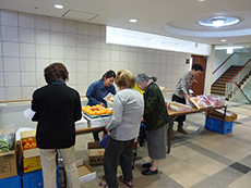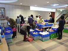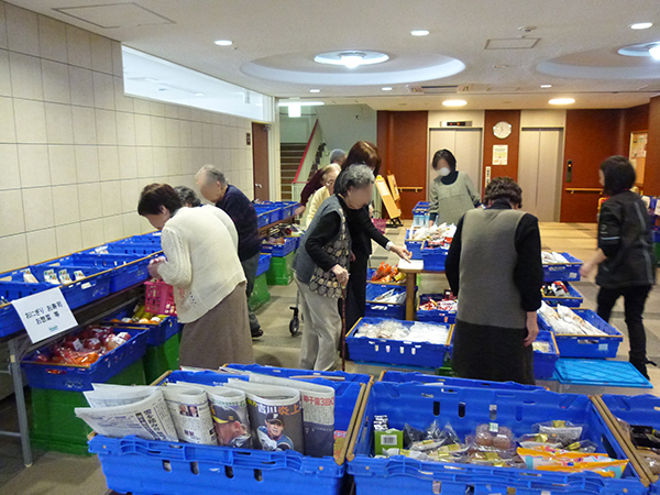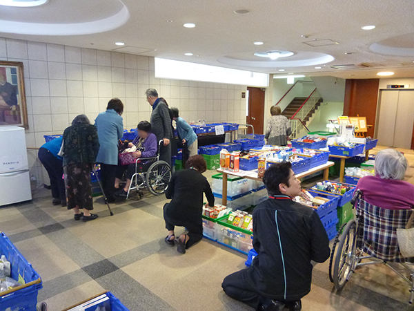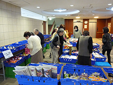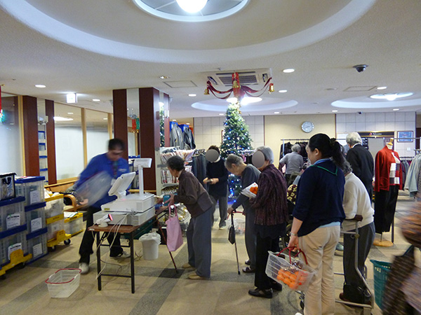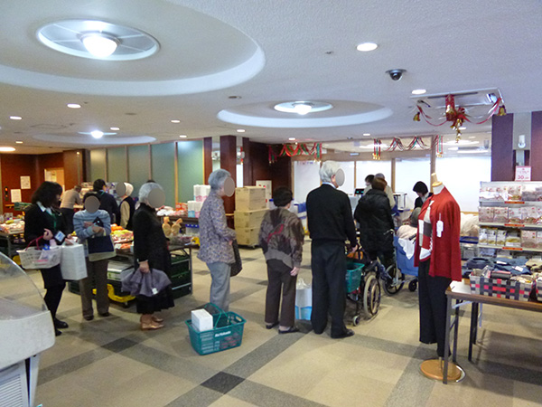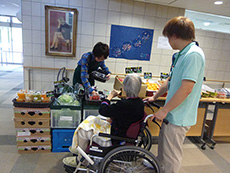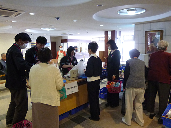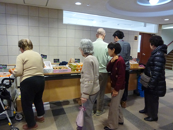 先月から始まったばかりですが、前回以上に入居者様がいらっしゃいました。11時30分から販売開始でしたが、待ちきれなくて、買い物かごを手に行列ができてしまいました。