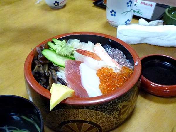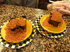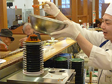 なごやか亭といえば、名物の『こぼれイクラ』です。 おおきなボールに入ったイクラをスプーンですくって従業員みんなで『ワッショイ』『ワッショイ』と唱和しながら盛り付ける実演が人気で、 しかも文字通りお皿にイクラがこぼれてます。