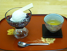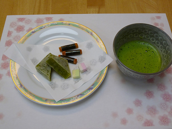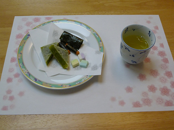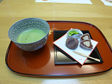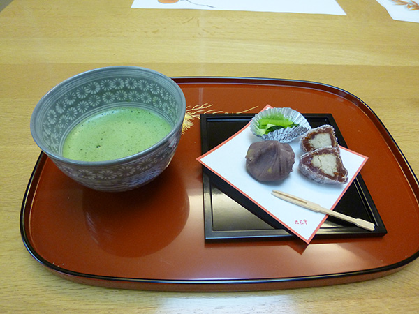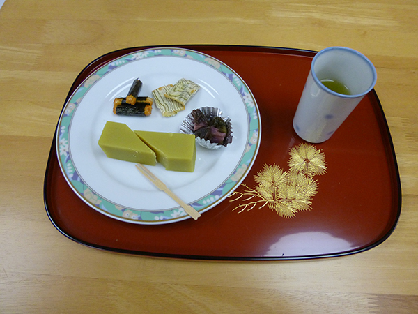 今月は、季節のお菓子 源吉兆庵「粋甘粛」と六花亭「山路」箸休めの盛り合わせとお抹茶を提供しました。