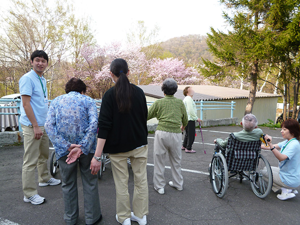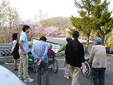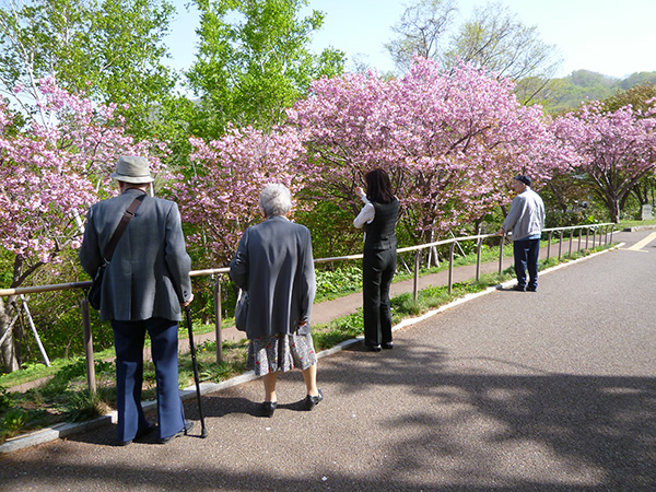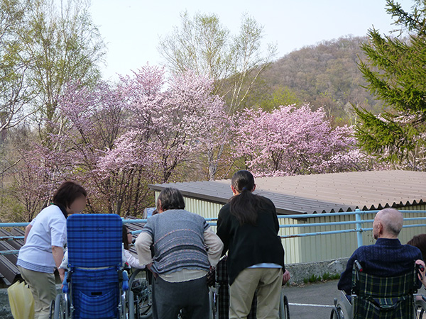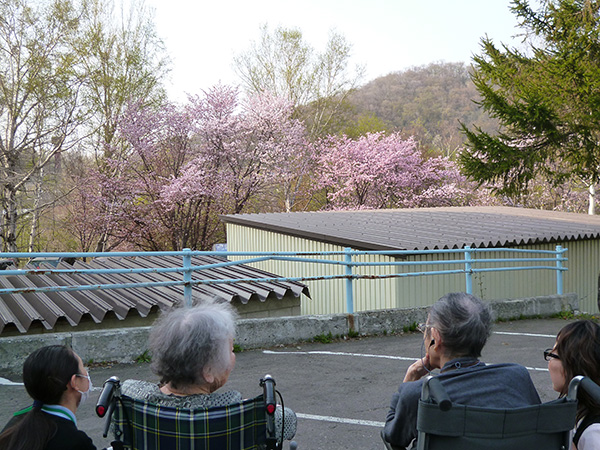 いろいろな桜の中でも、花色の赤みが濃く綺麗なピンク色が特徴です。今日は天気も良く暖かったので、入居者様と一緒にプチ花見をしました。