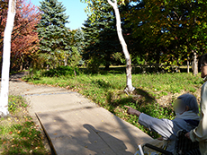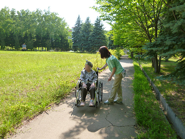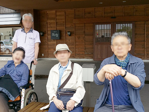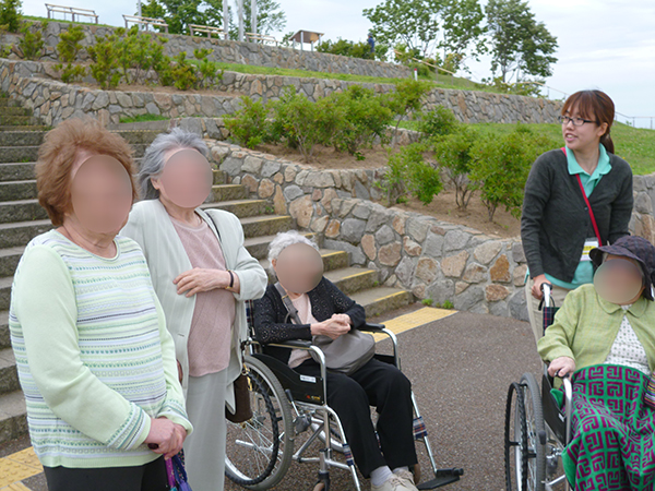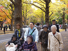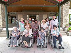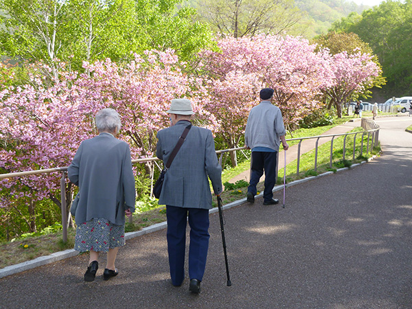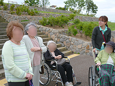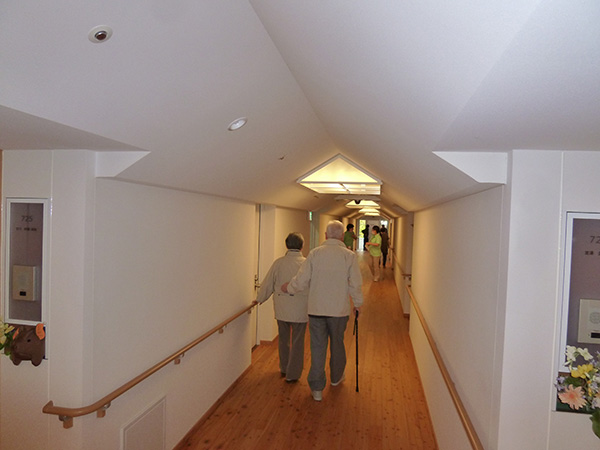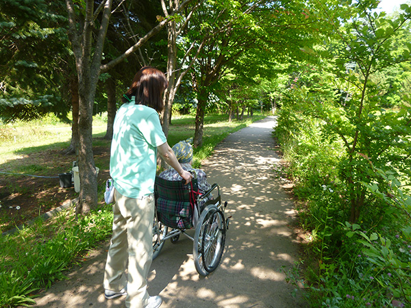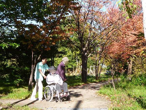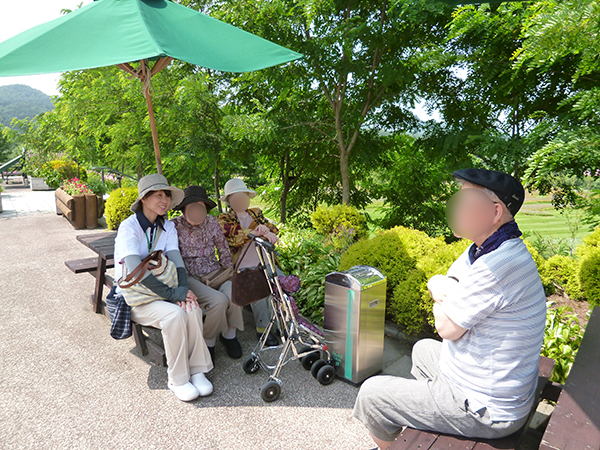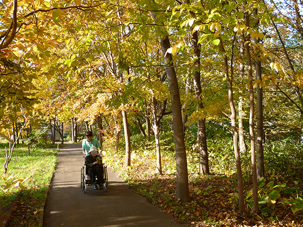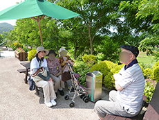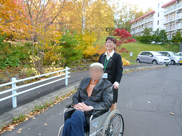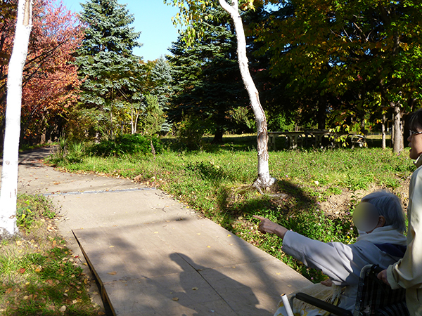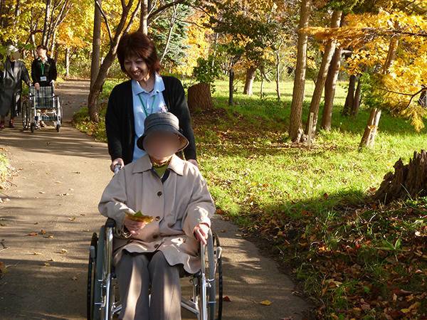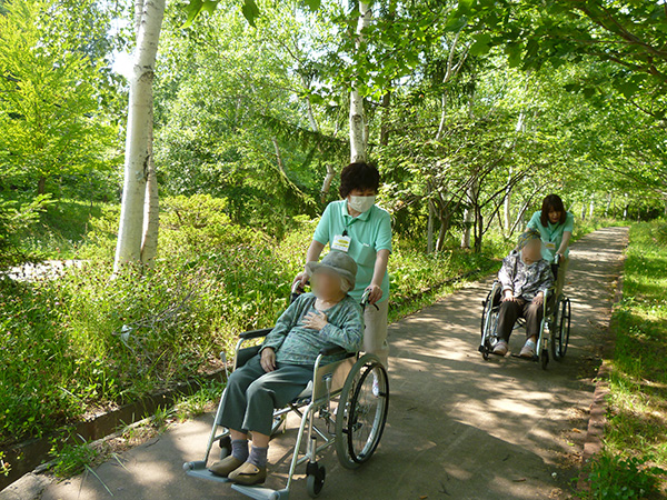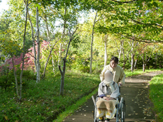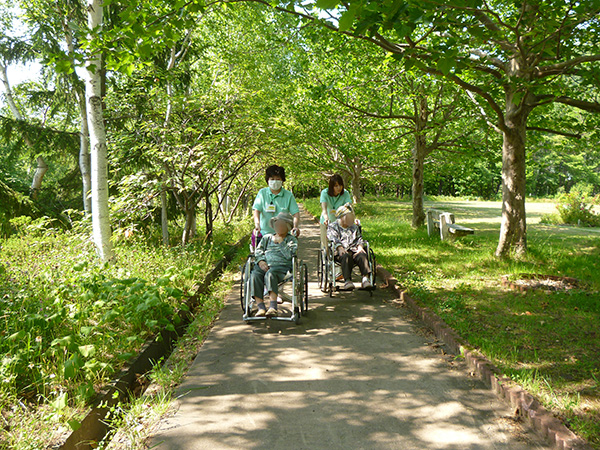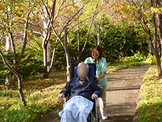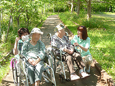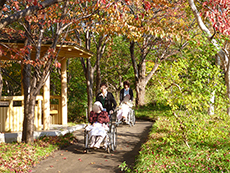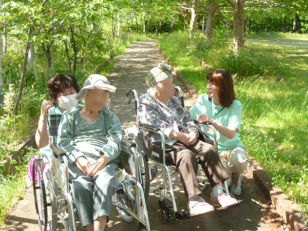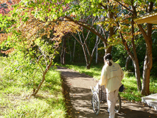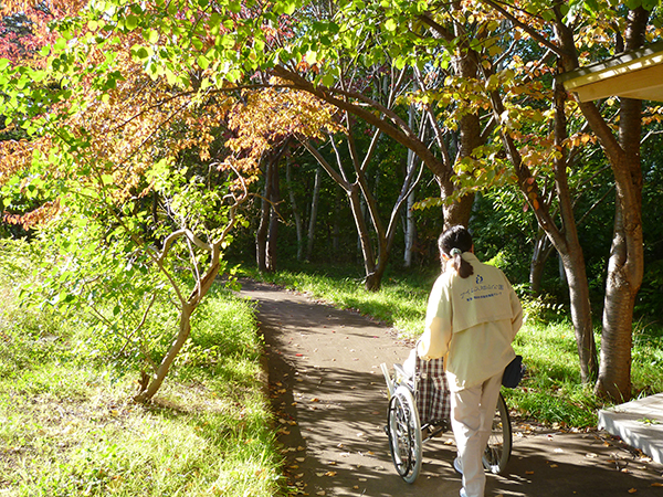 この日も木洩れ日のなか散策路を歩き、カメラを向けると両手を振って下さり入居者様の笑顔がとても印象的でした。