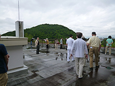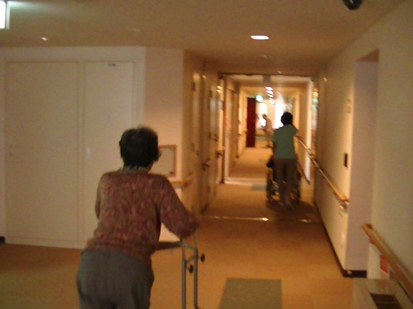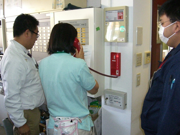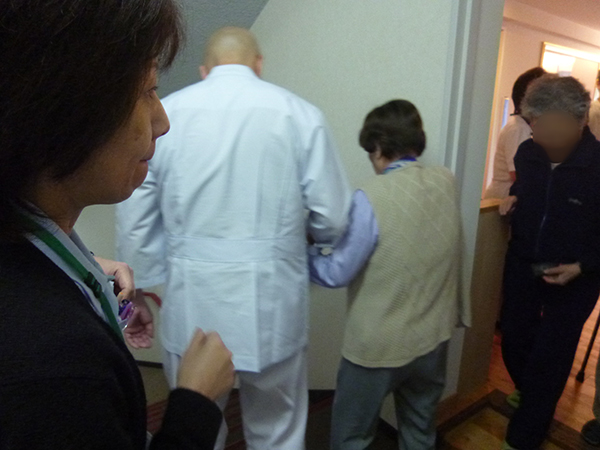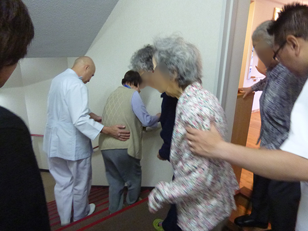 居室からの出火を想定し介護、看護を中止として全職員が協力して入居者様を避難いたしました。 高齢者を配慮し、安全重視で行うため車いすの方は各階ホールまで、自立の方は屋上や外まで出ていただき、13分35秒で避難完了しました。