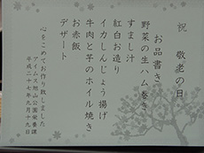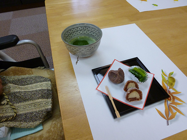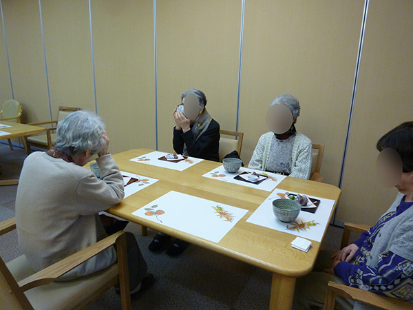 箸休めに野沢菜を添え、いろいろな味を楽しめると好評で、入居者様同士で柿と栗の話で会話が弾んでいました。