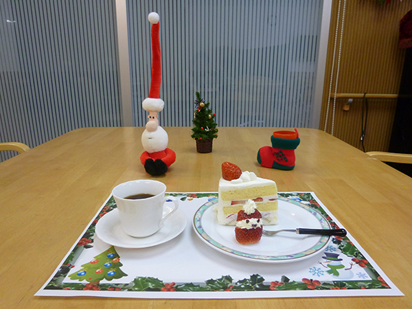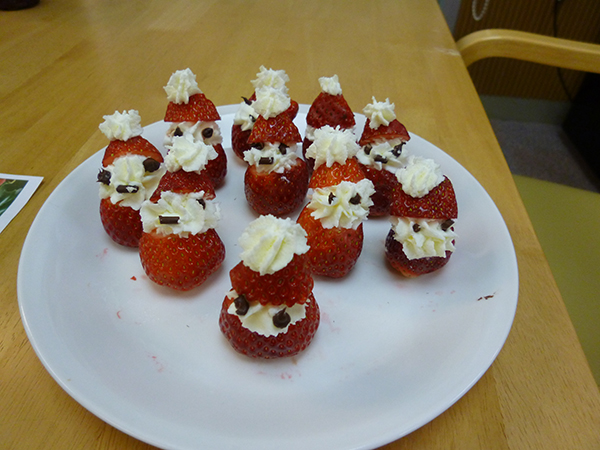 今月はクリスマスをテーマに、イチゴのショートケーキと、スタッフがイチゴにちょっと手を加えサンタクロースに見立てたものをお出ししてみました。