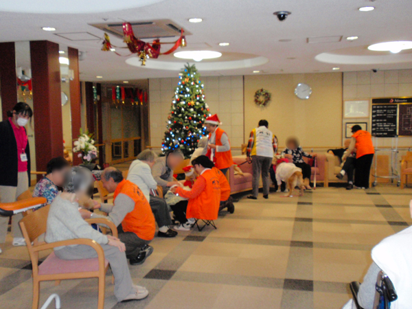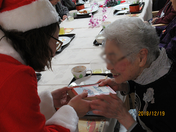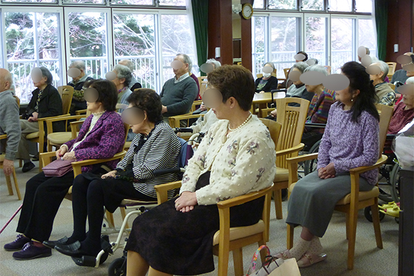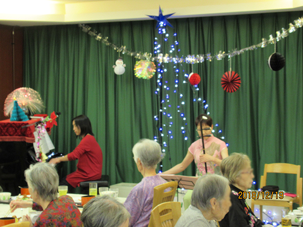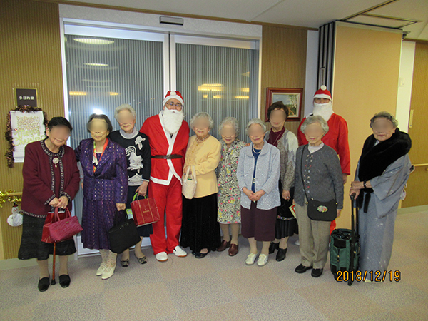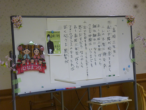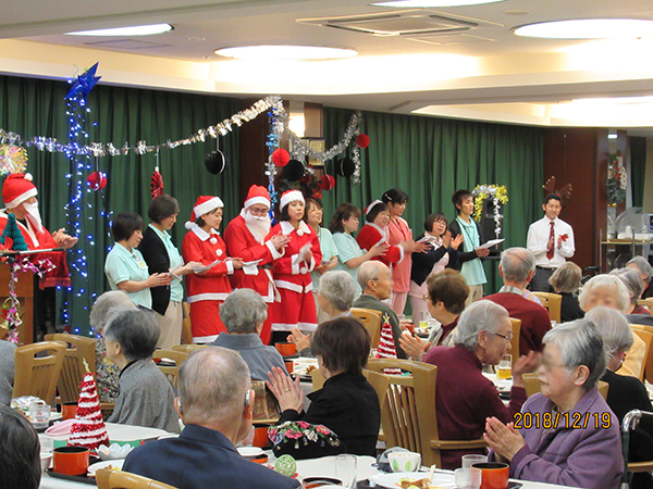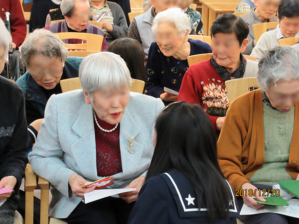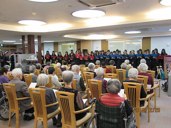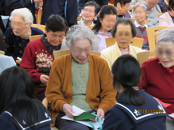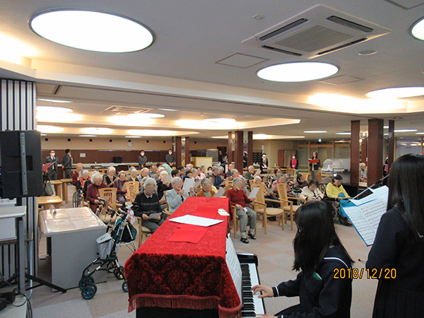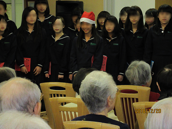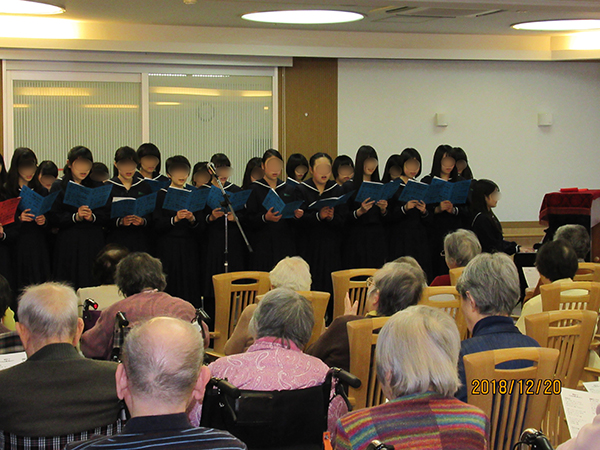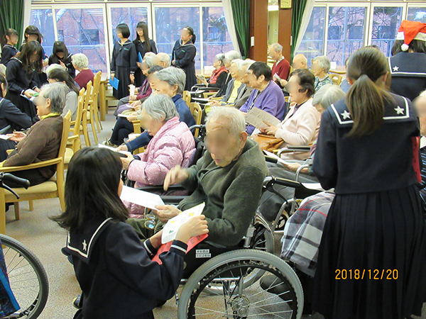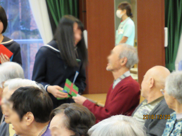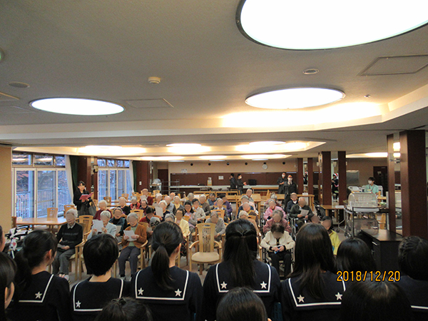 49名の生徒さんが来てくれて入居者へ歌のプレゼントと手作りのカレンダとモビラートとメッセージカードのプレゼントしてくれました。入居者の方々はとても喜ばれて北星OBの方もいらしてアンコールでは校歌をリクエストされ皆さんは楽しい時間を過ごされた用です。