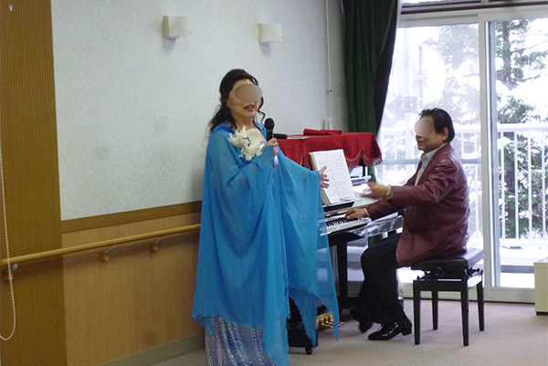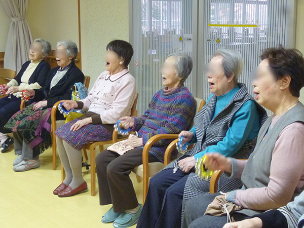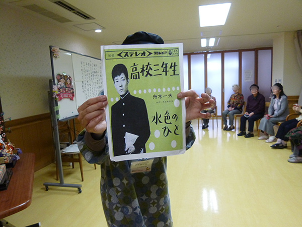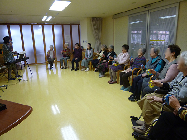 月に一度の音楽セラピーを楽しみにされていて先生指導で歌謡曲~唱歌~童謡など体操なども交えて行っている為