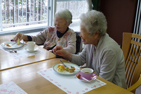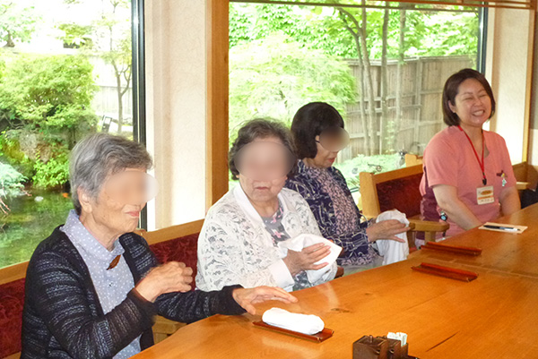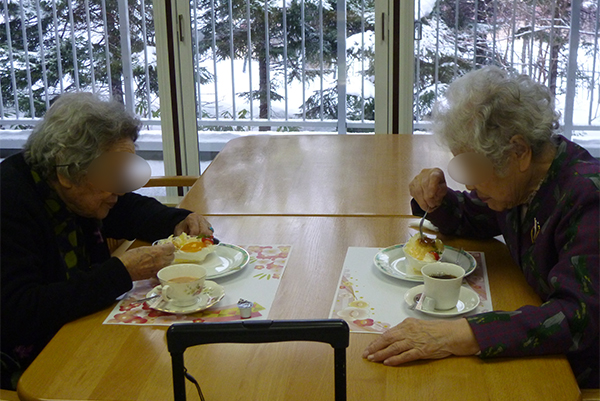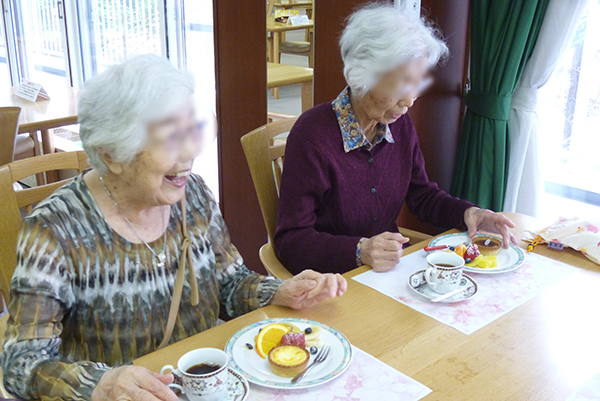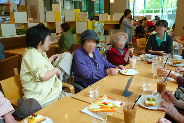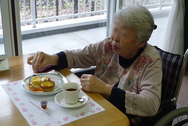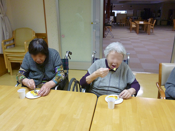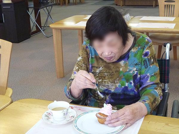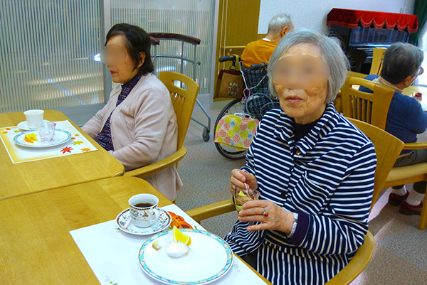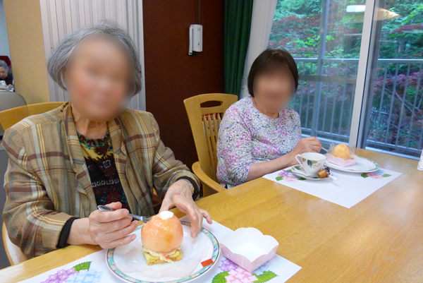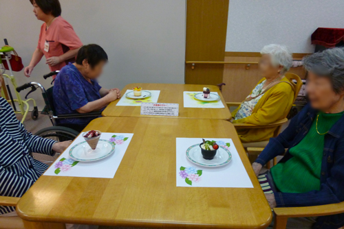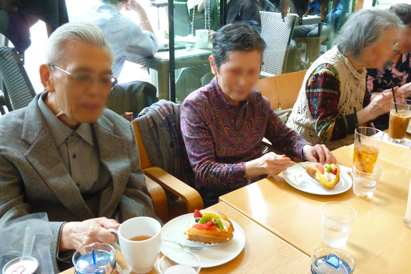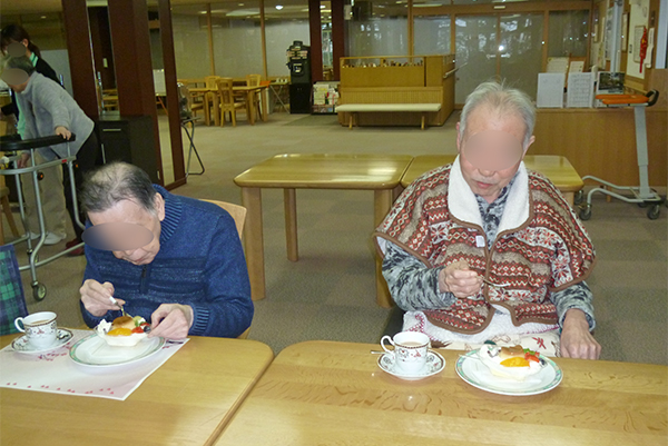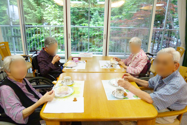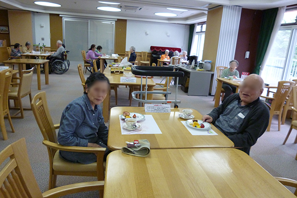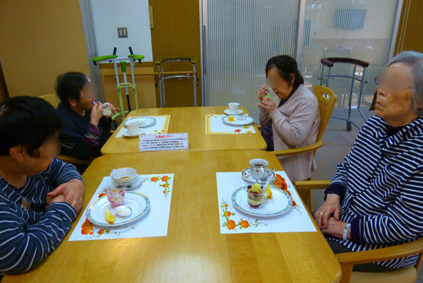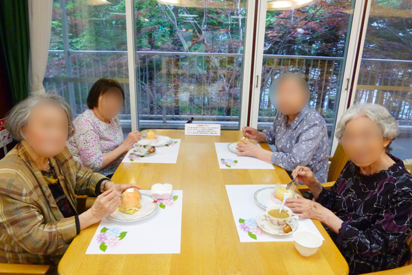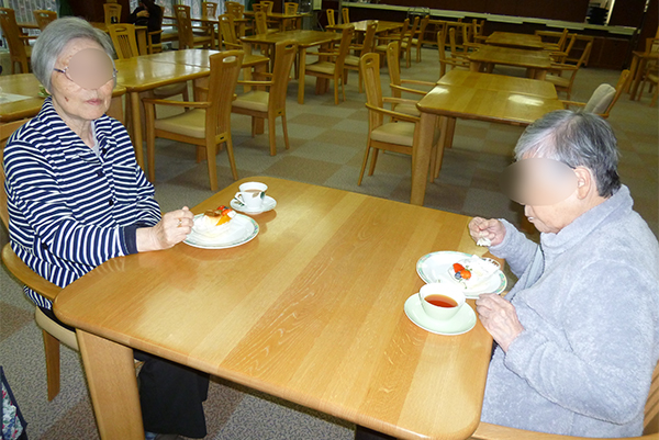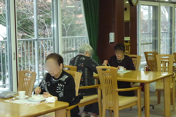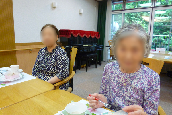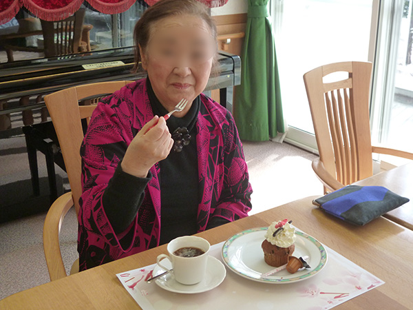 「お腹いっぱいに食べましたと話されデーザートは別腹」とケーキを食べられていました。帰り際には楽しいから又連れて来て下さいねと話され皆さんもデザートも黙々と食べられていました。