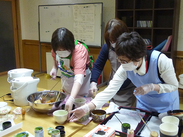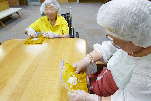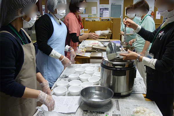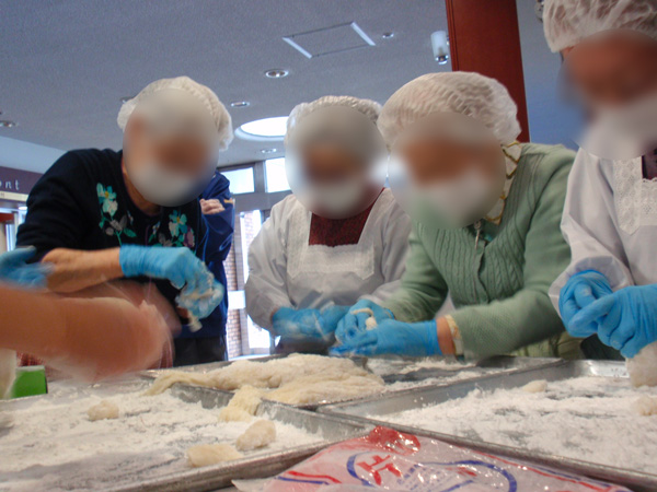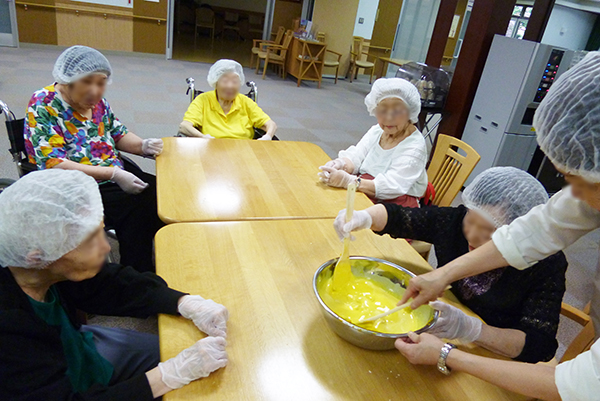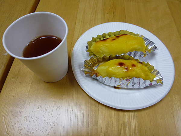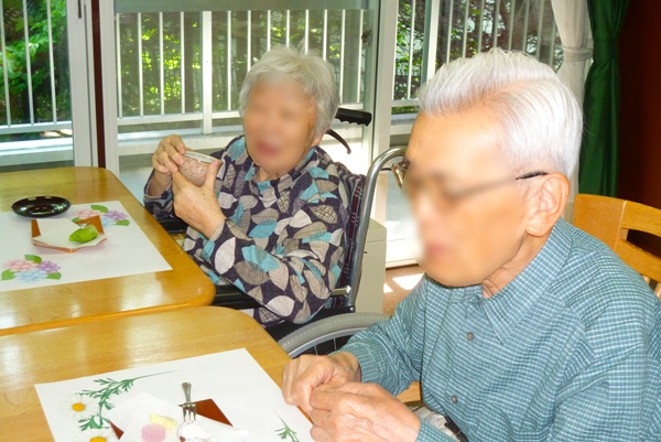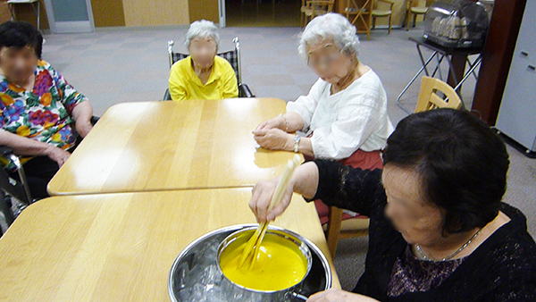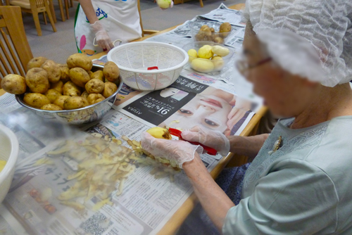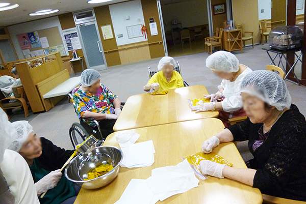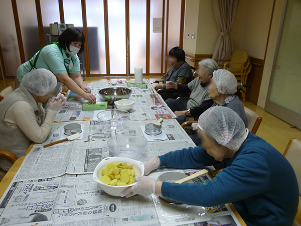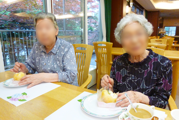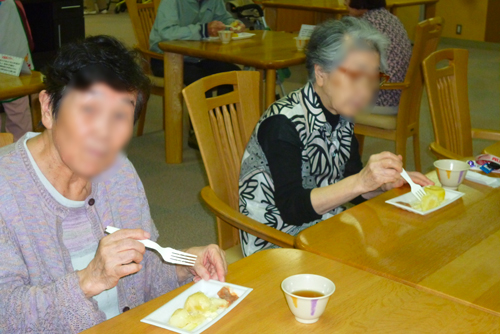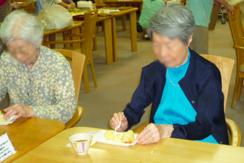 いも餅は何度か作りましたがかぼちゃは初めて挑戦してみました。捏ねるのも、丸めるのも手際よく皆さん作られホットプレートで焼いて、あまだれを付けて食べてもらうと「今回のいももちかぼちゃ餅はふわ~、もち~として一番おいしい」と皆さんおかわりをして食べられていました。