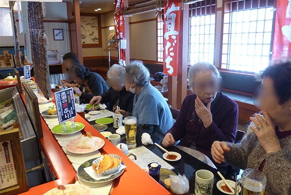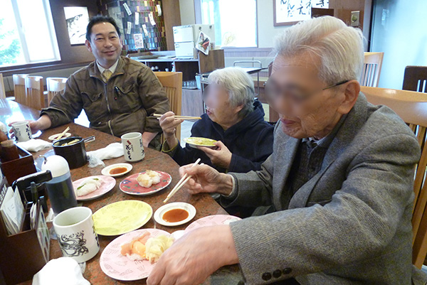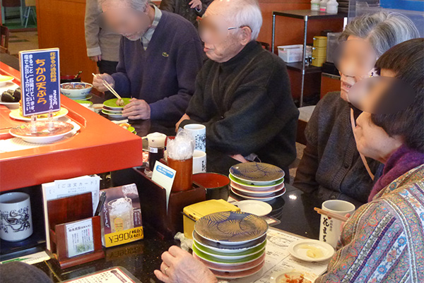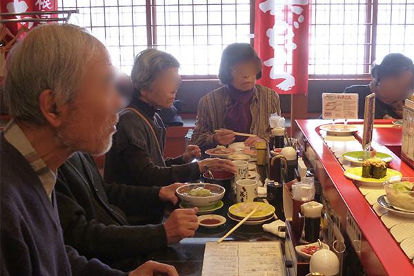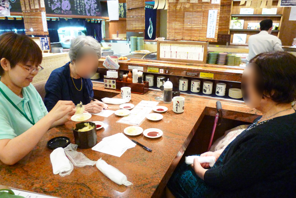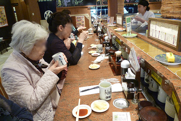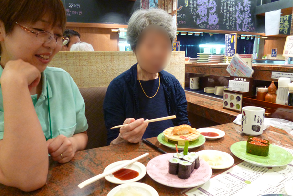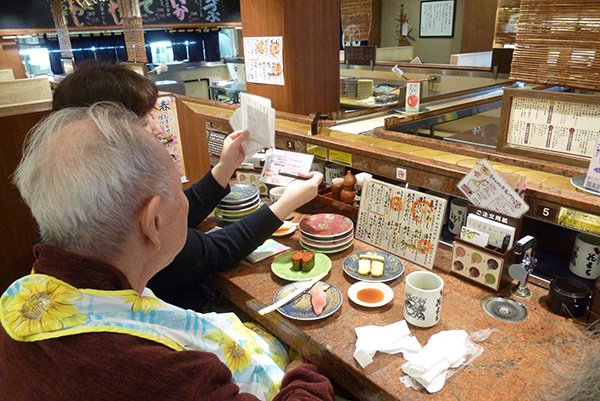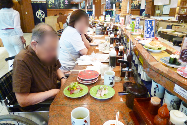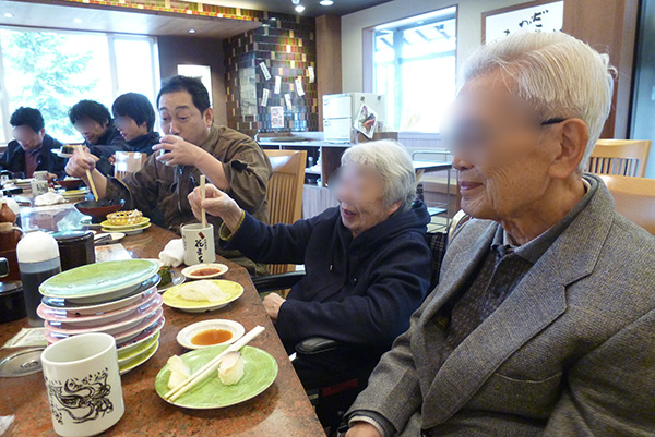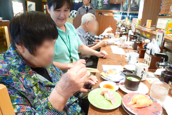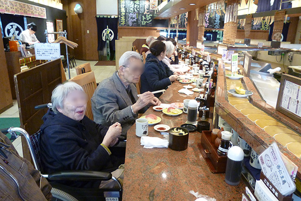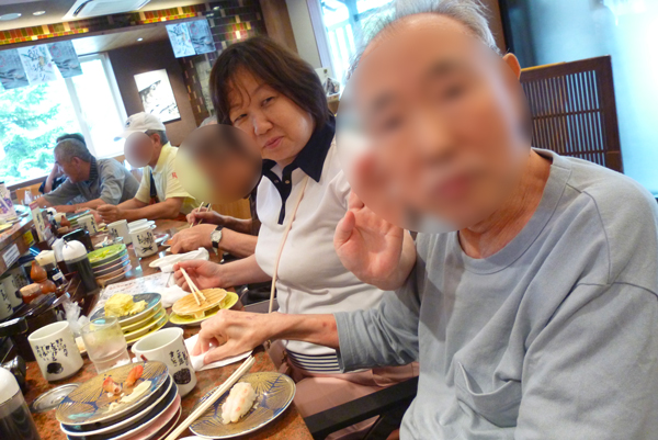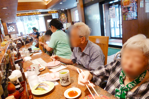 夏祭り 2018.07.31 回転寿司ツアー 2018.07.18 今日は回転寿司の『はなまる南25条店』に行ってきました。入居されて初めて参加された方もいて「お寿司を食べる事が夢だった」と話され願がかなったと嬉しそうにお寿司を食べられていました。他の入居者の方も回転寿司に来るのが楽しみのの一つですと話されていて今日も皆さんお寿司をたくさん食べて満足されて施設へ戻りました。