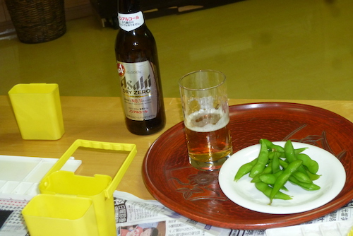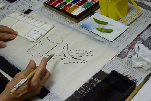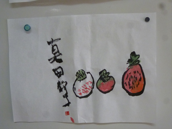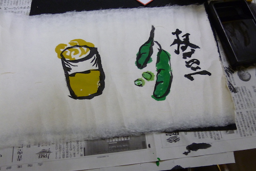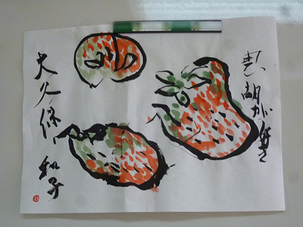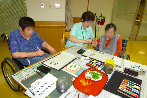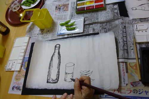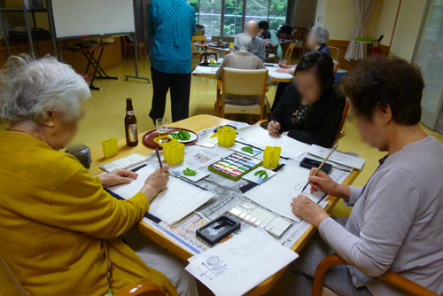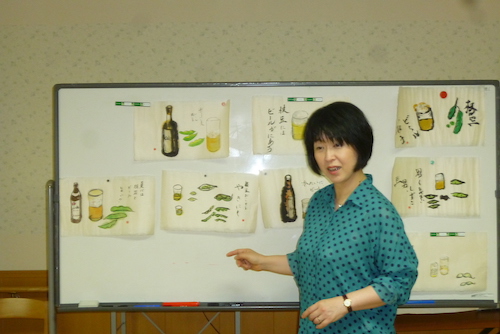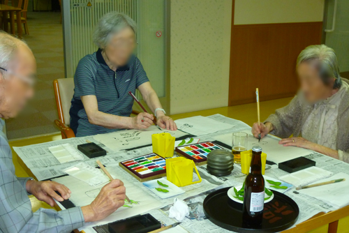絵手紙 2018.08.29 今月のテーマは「枝豆&ビール」で皆さん上達が早く先生からも「いいですね~」と褒められていました。 「私はビールが飲めないの」と話されていた方もノンアルコールビールですと伝えると絵を描き終わると枝豆とビールを飲まれて本物のビールみたいと楽しそうに話されていました。 今回の作品は施設内に展示を予定しております。