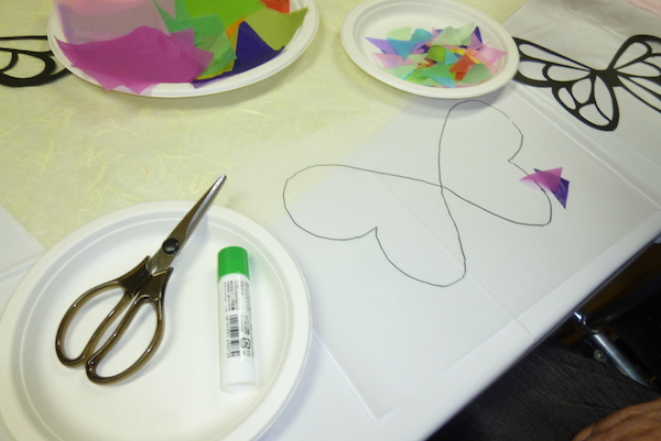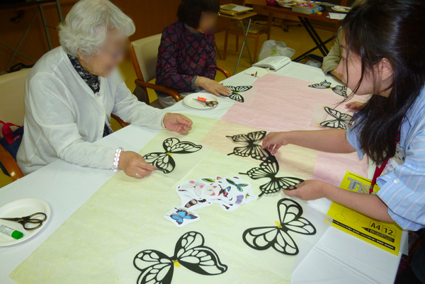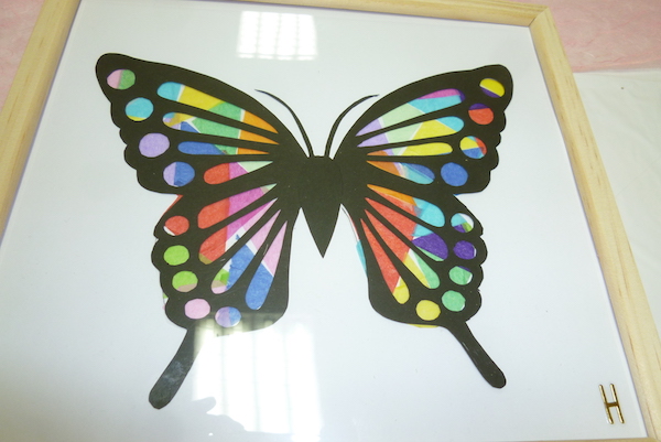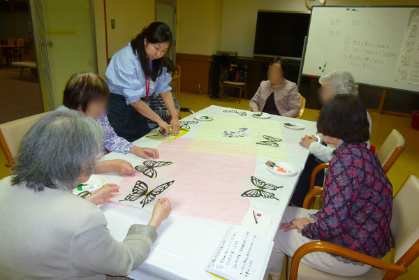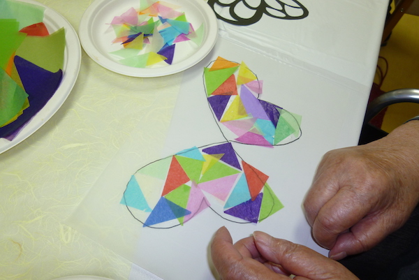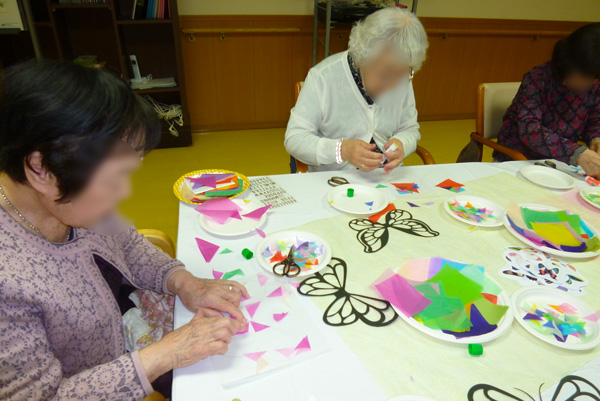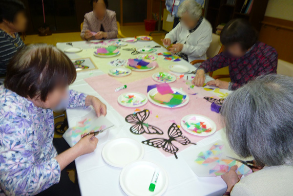 外出レク 円山動物園 2018.06.20 アイムス喫茶 2018.06.19 アートセラピー 2018.06.09 今月のテーマは『蝶』でカラーペパーを細かく切ったものを一枚の台紙に貼ってもらいましたが色合わせ考えながら貼って行くのに時間を要して作った物に蝶をかたどった物を上からのせて蝶の形に切り取って完成しました。
