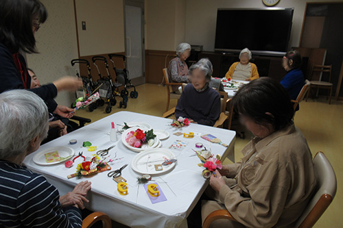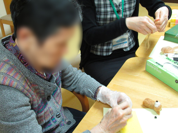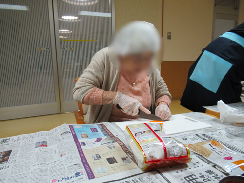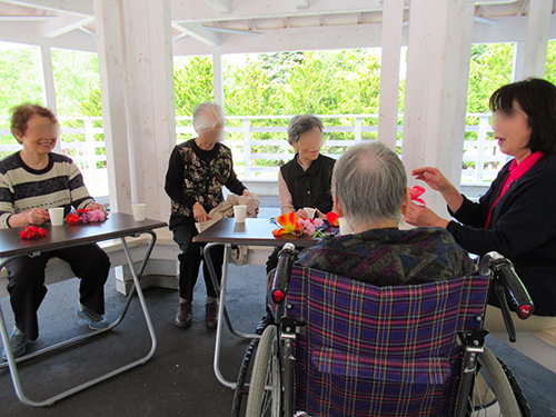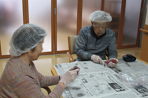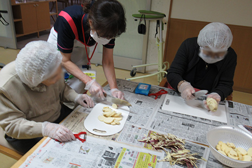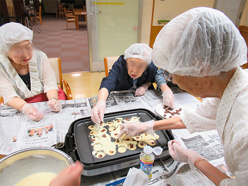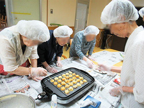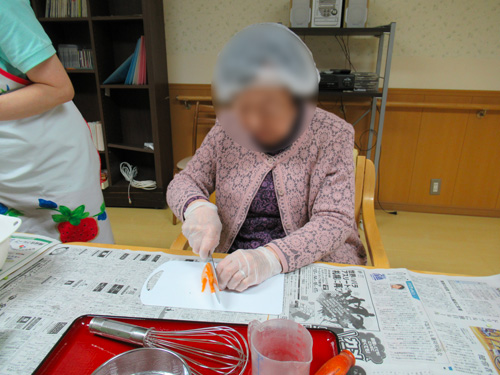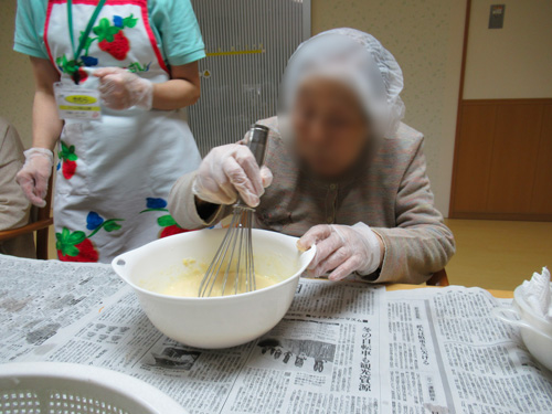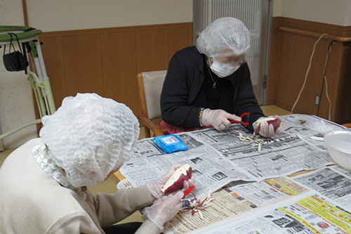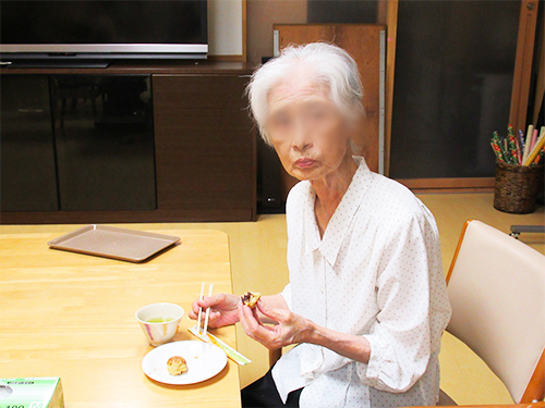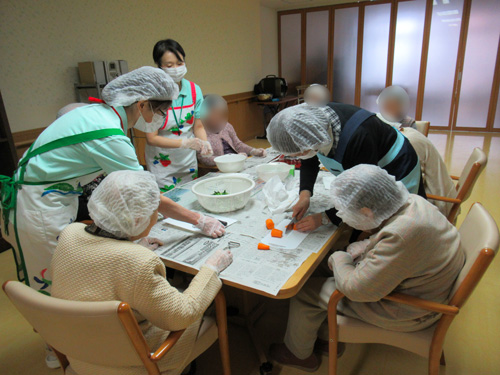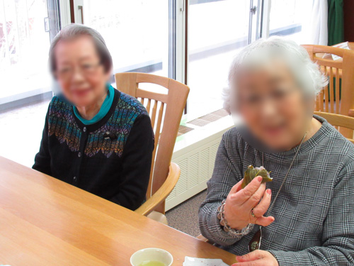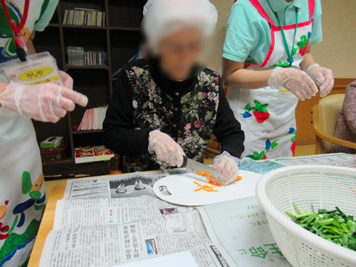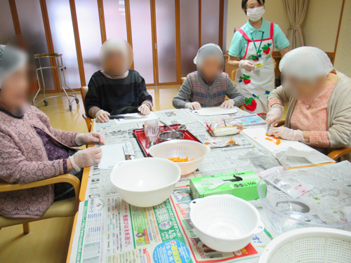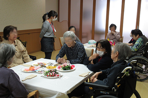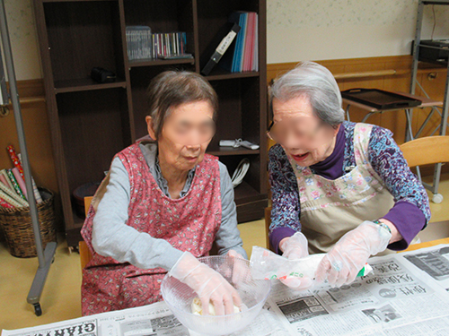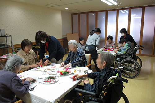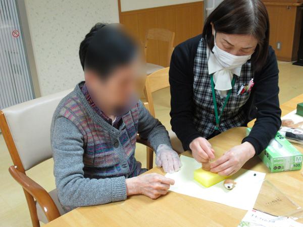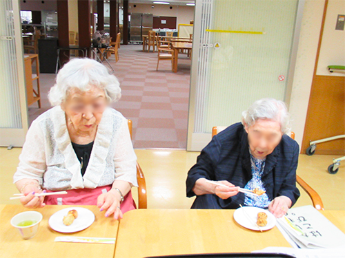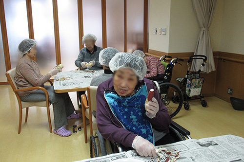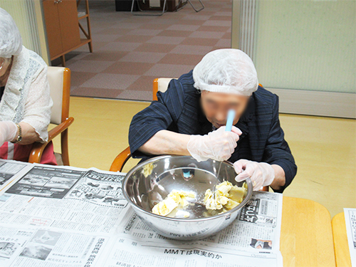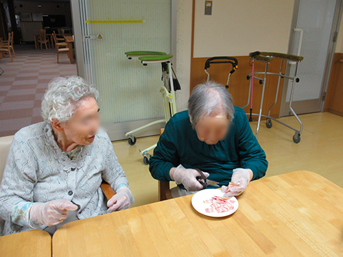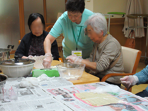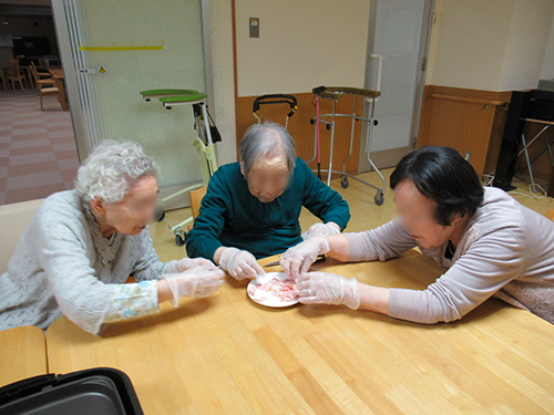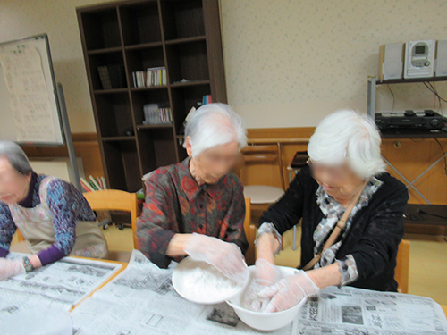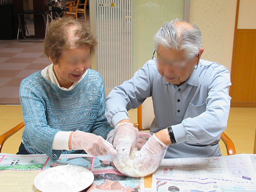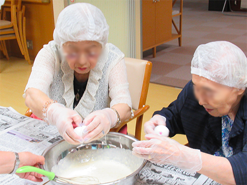 ご夫妻で参加された方は二人で仲良く「少しい大きいね!もう少し小さくしたら」など話されながら白玉を捏ねてまるめていました。他の入居者の方々も皆さん楽しそうに作ってました。