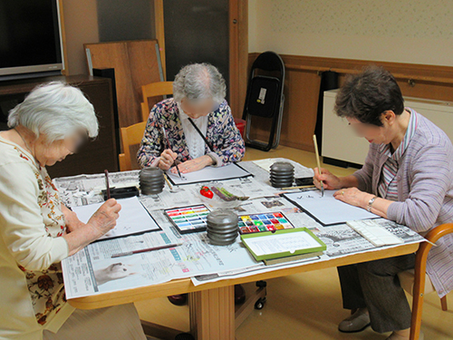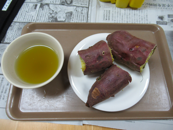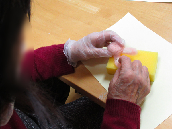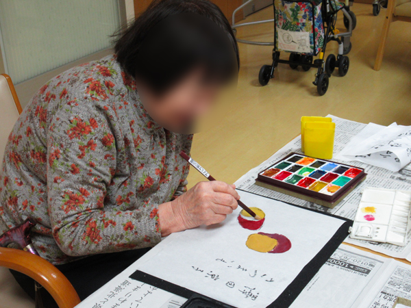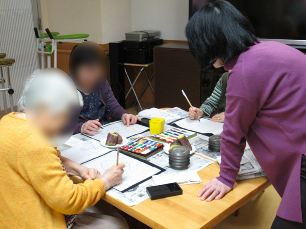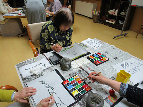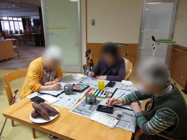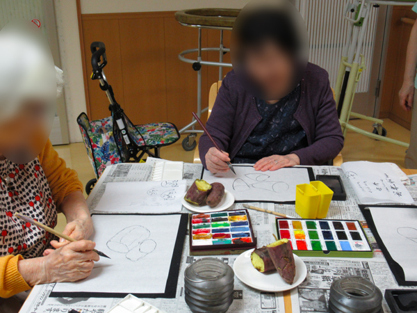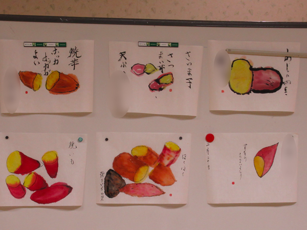 描いた後はお楽しみの「もぐもぐ」タイムで「焼き芋は美味しいね」と皆さん笑顔になっていました。来月は皆さんの要望でイチゴで描くことになりました。