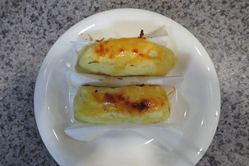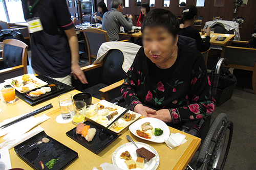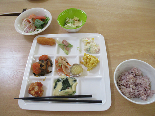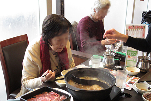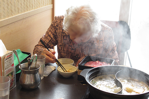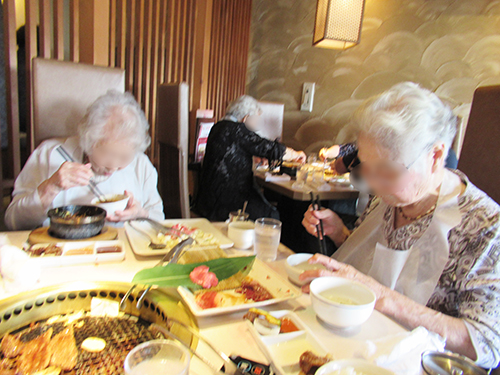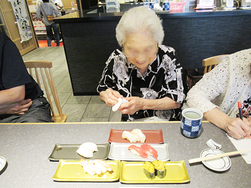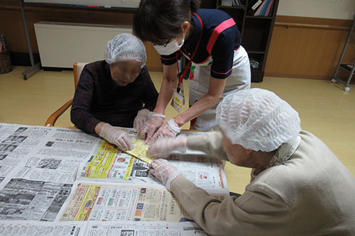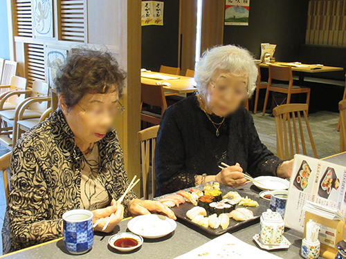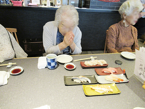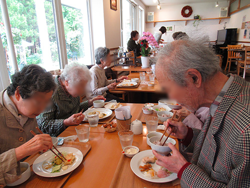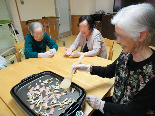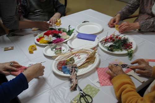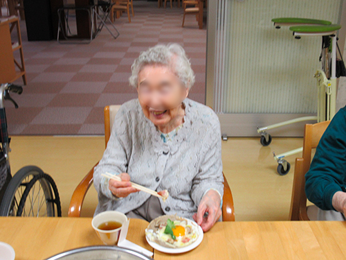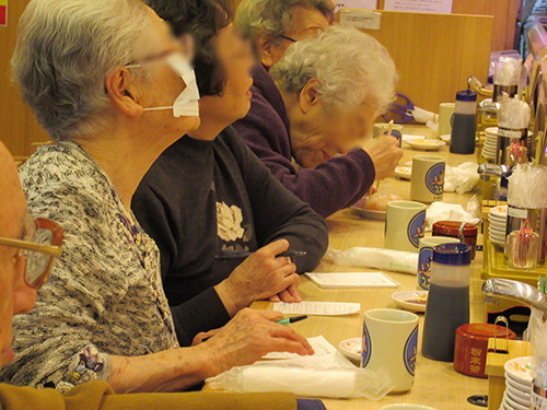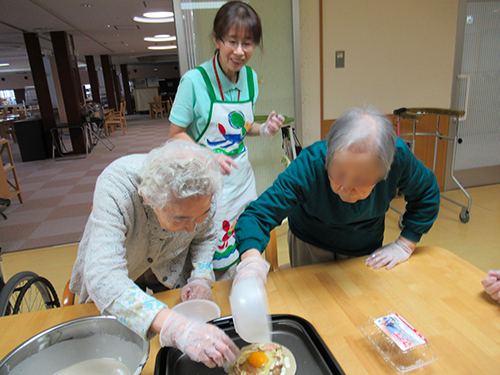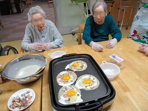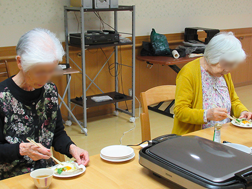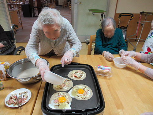 「そば粉のガレット」てどんな物?見たことも聞いたことも無いと入居者の方々は興味深々、そば粉を少しねかしている間に具の準備をし真ん中に玉子が乗らなくて苦心されていましたが出来上がって食べられると「もちもち」として美味しいね、戦時中にこの食べ方を知っていたらそばをもっと美味しく食べられたね」と話される方もいて始めてガレット作りを楽しみました。