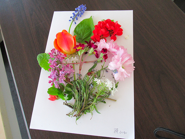 レインボーシートを使い花火を描くと、出来栄えに皆さんビックリされていました。もう一枚はハガキに色鉛筆でぶどうを描き筆とは違った作品が出来上がりました。