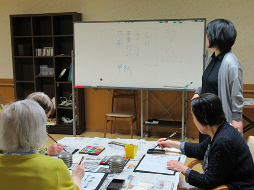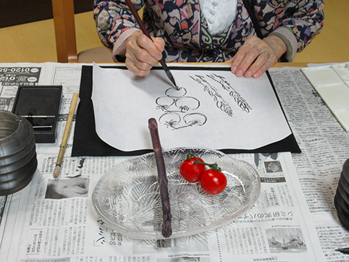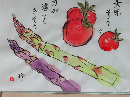 講師からアスパラとトマトの描き方の説明がありアスパラは穂先の三角の部分から、トマトはヘタから描き始め今日初めて参加された方も上手に描かれていました。講師からも優しい絵が多いですねと話されていました。描いたトマトをその場でみんなで食べて終了しました。次は焼きトウモロコシに挑戦してみたいとの声もありました。