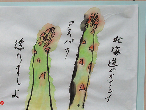 絵手紙教室 2019.5.15 今日の画材は今が旬の「アスパラ」と「トマト」です。