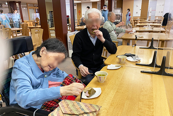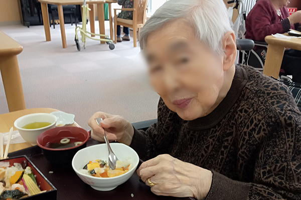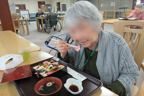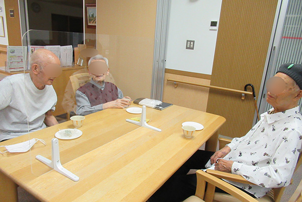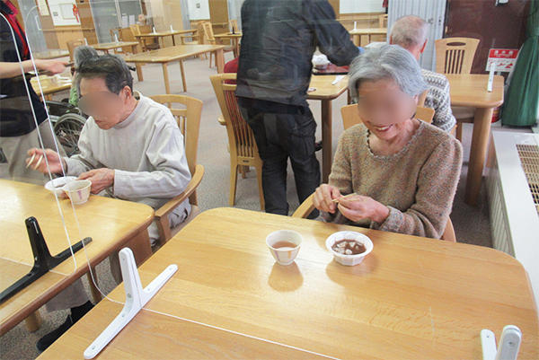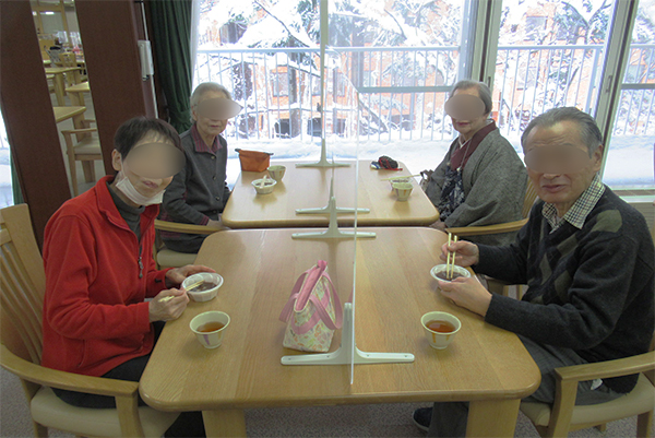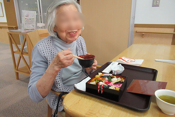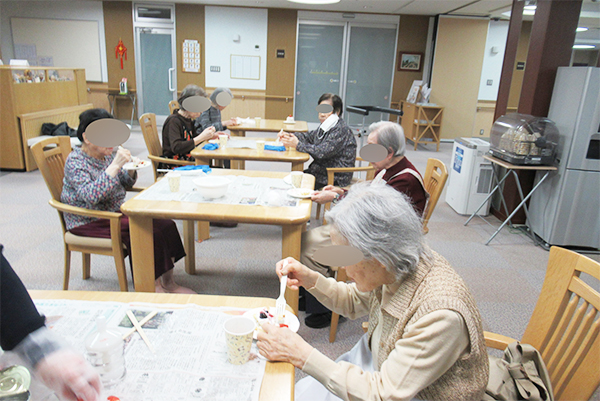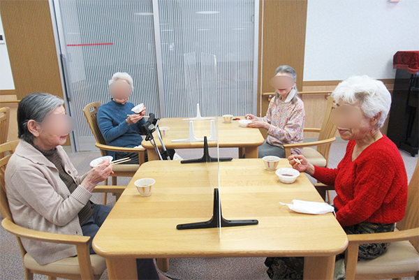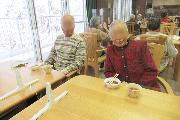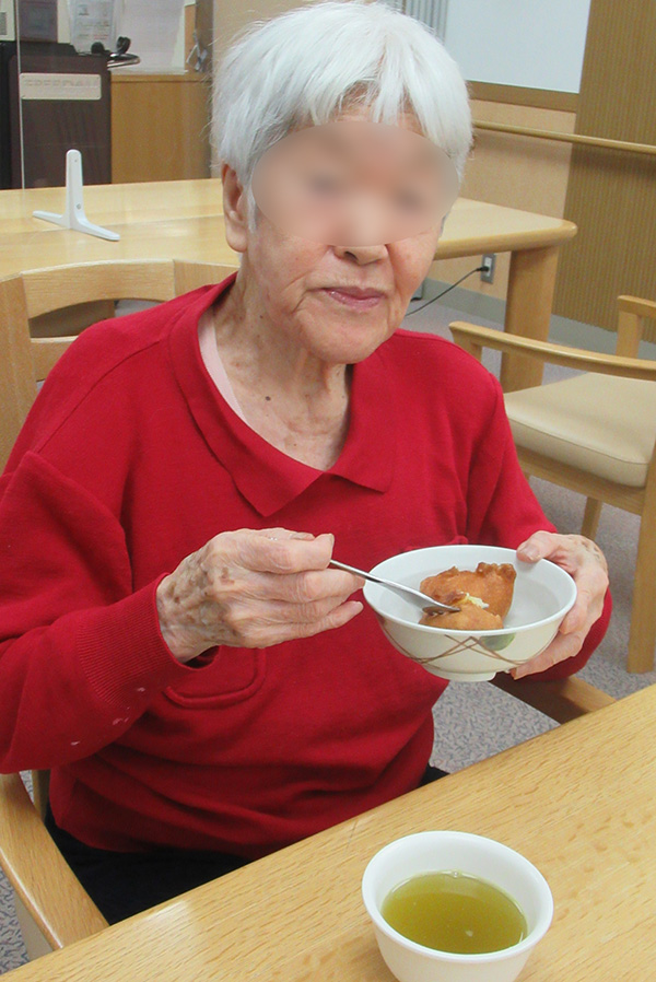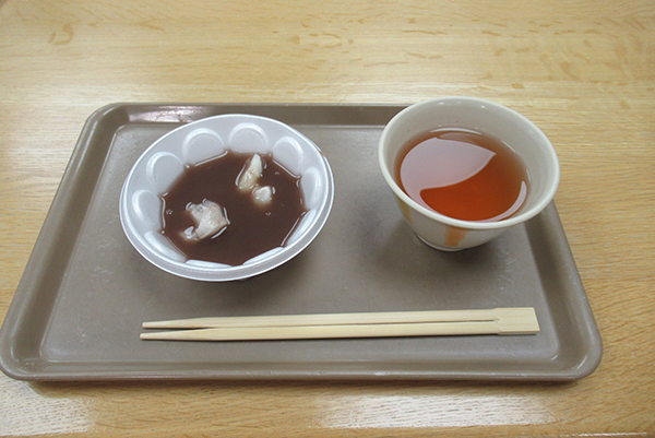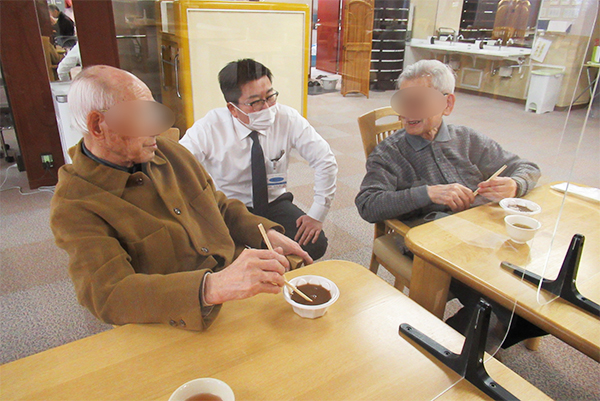 | 入居者様の無病息災を祈願して「鏡開き」を行いました。 お供え餅をお汁粉にして、餅が固くて食べられない方にもムース餅入りのお汁粉を提供させて頂きました。 入居者様からは「今日のお汁粉はちょうど良い甘さで美味しいです」「100歳過ぎてお餅を食べられて嬉しい」等と話されていて、おかわりをされる方もいて甘くて温かいお汁粉は体と心を温めてくれたようです。 | |||