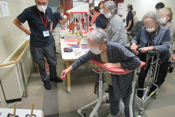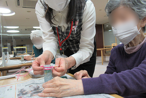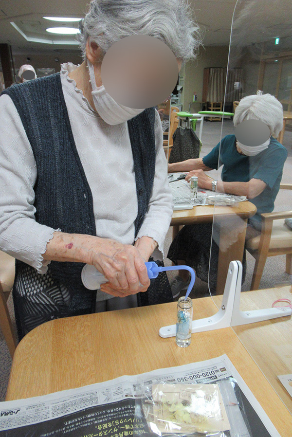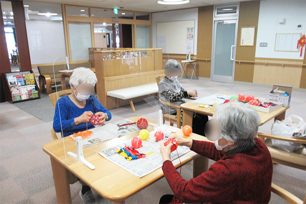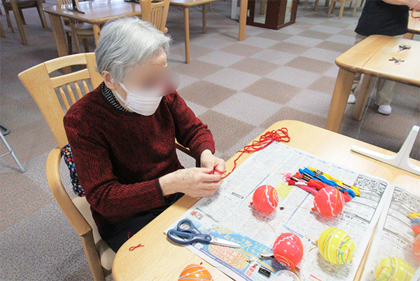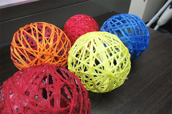 | 水風船を膨らまし糸を巻き付けてボンドを塗り、乾かして風船をわり完成です。 風船に糸を巻くのが大変そうでしたが、コツを掴むとたくさん作って飾ると 可愛いねと3~5個作られた方もいました。 | |||