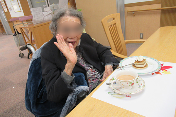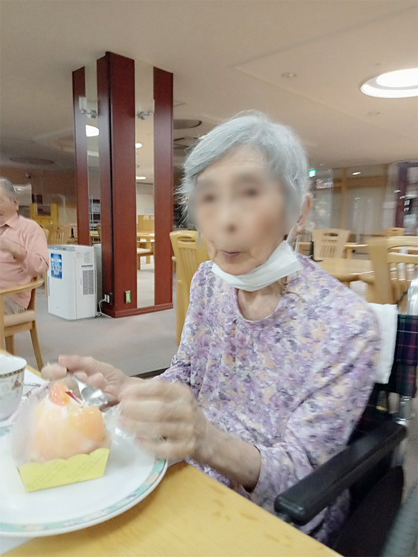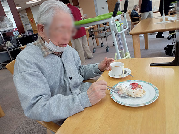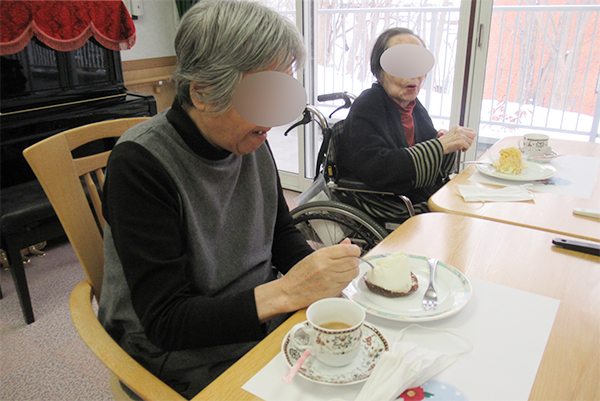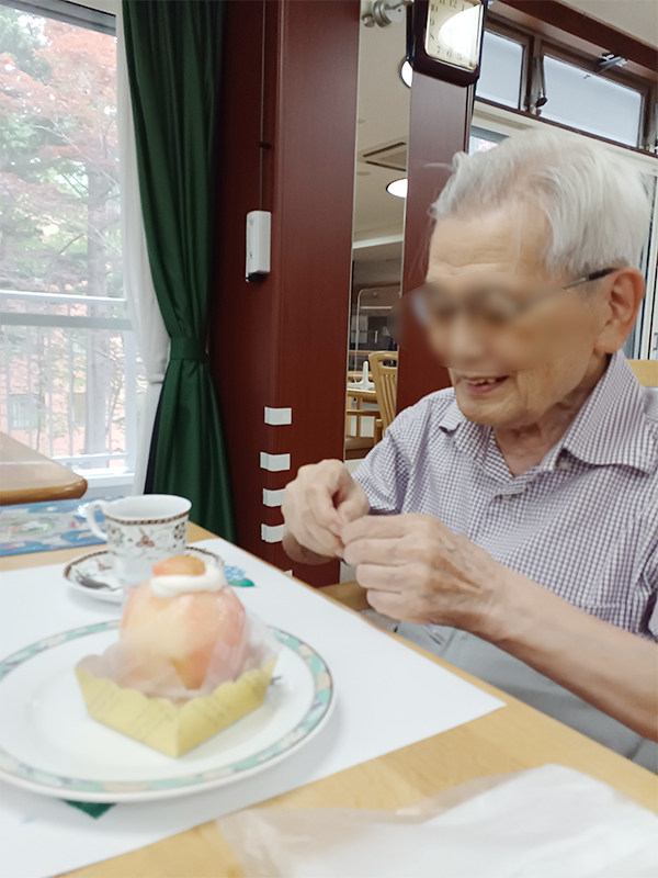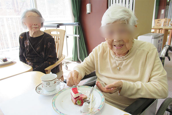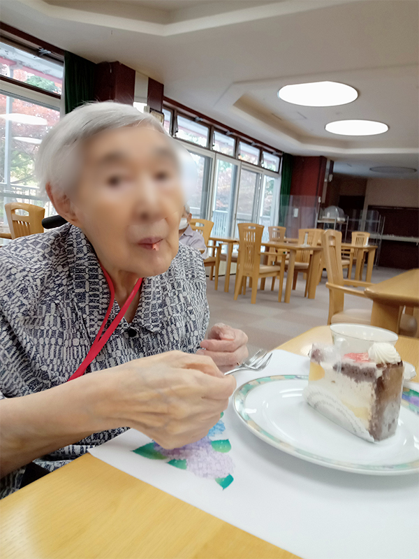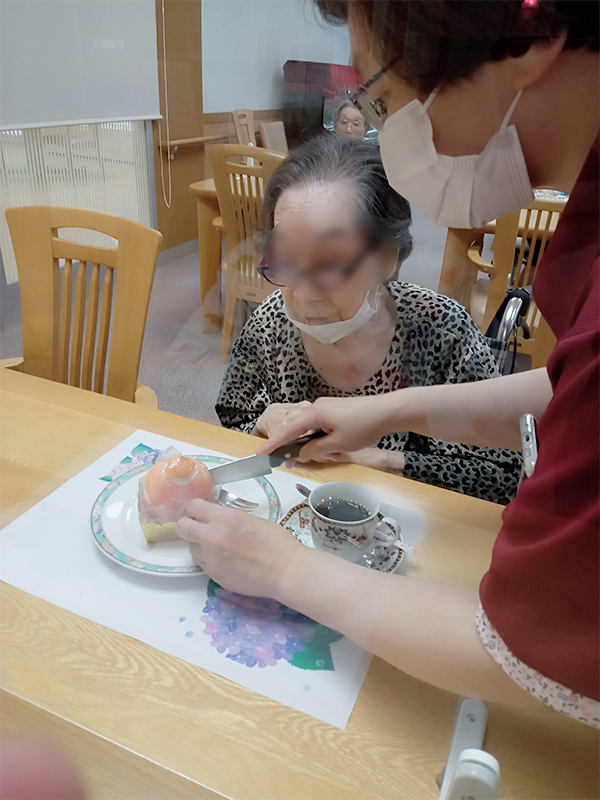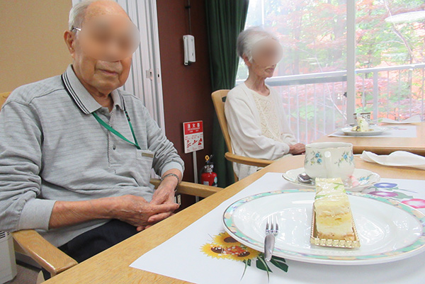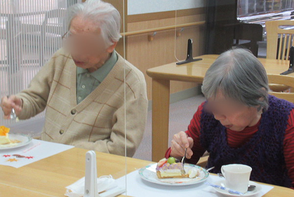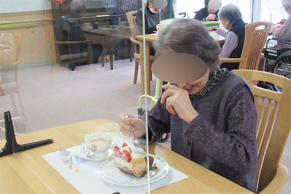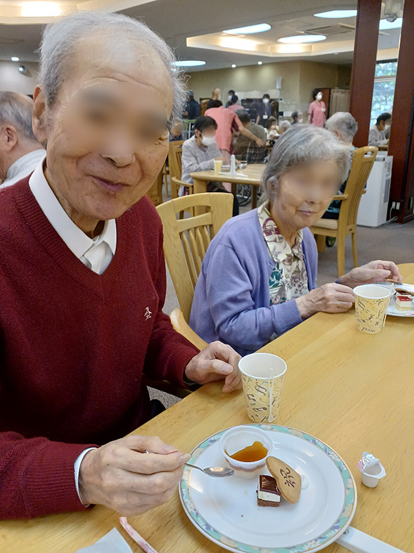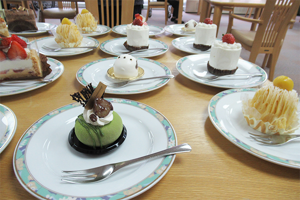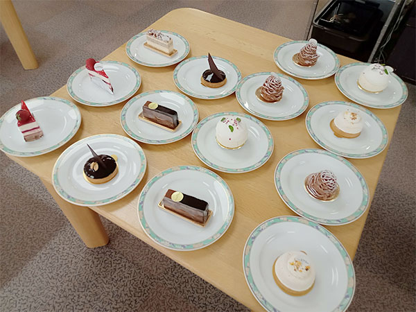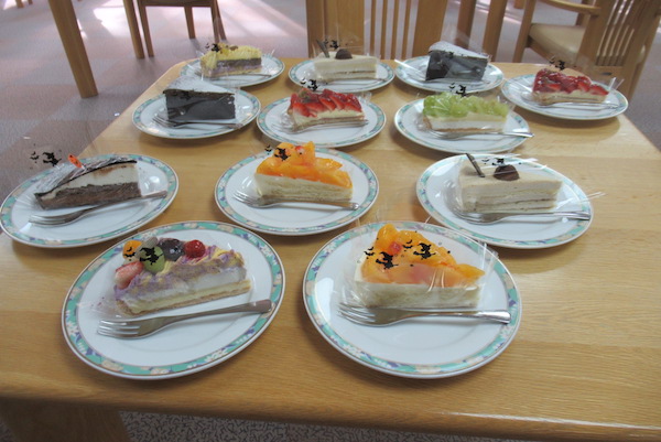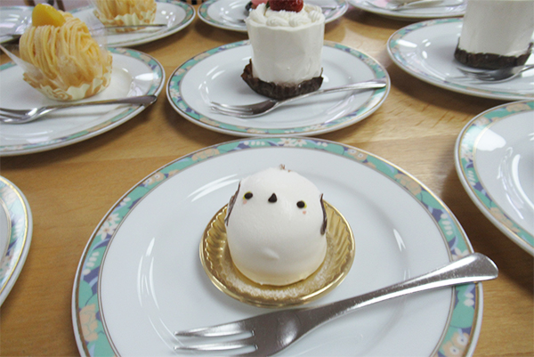 | 今月は、パティスリー・アカツキのケーキを準備してアイムス喫茶を行いました。 可愛いクマ、ハリネズミのケーキもあり「可愛いから何処からたべようか」と迷われている方 定番のイチゴショート、モンブラン、季節のケーキを食べて 今日のケーキは軽くて食べやすくて美味しいと笑顔で話され、入居者同士の会話も弾み 楽しい時間を過ごされていました。 |