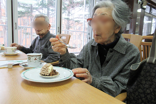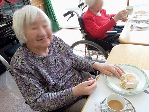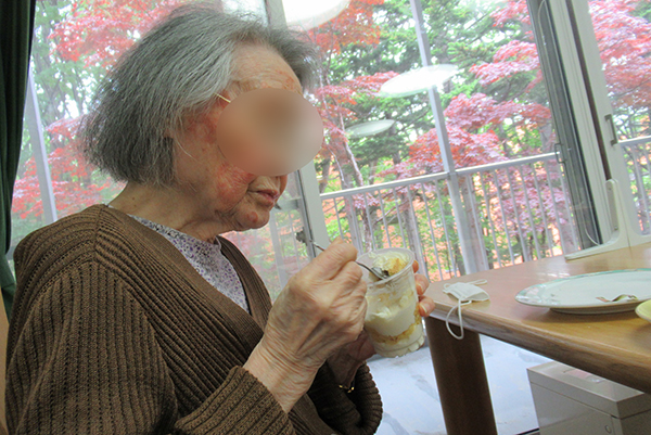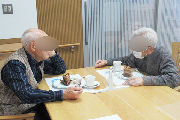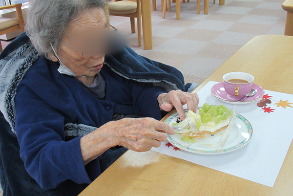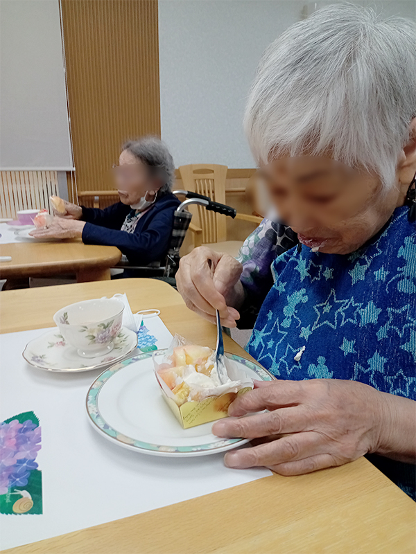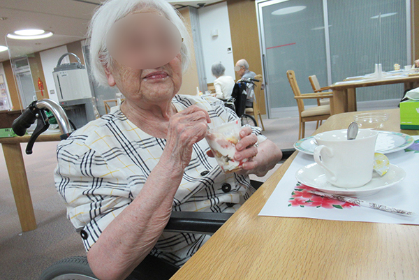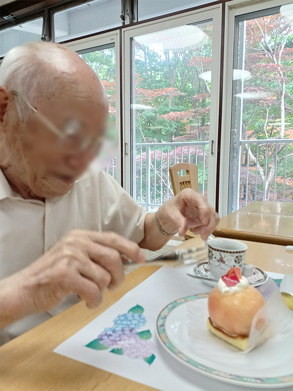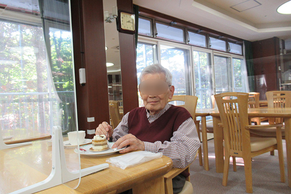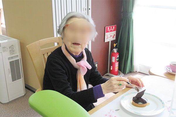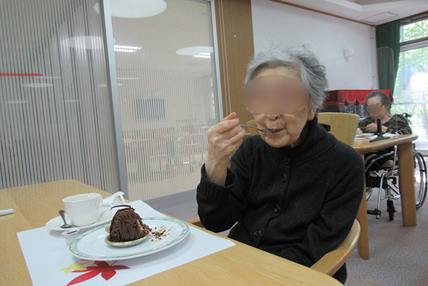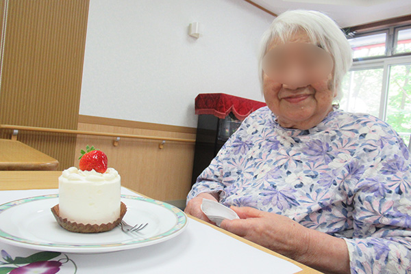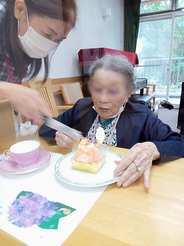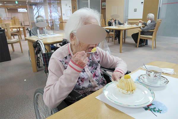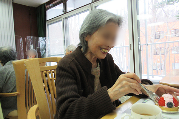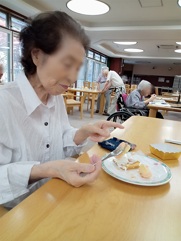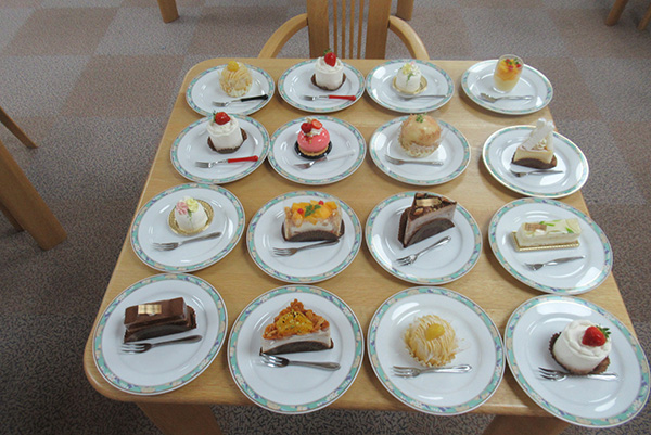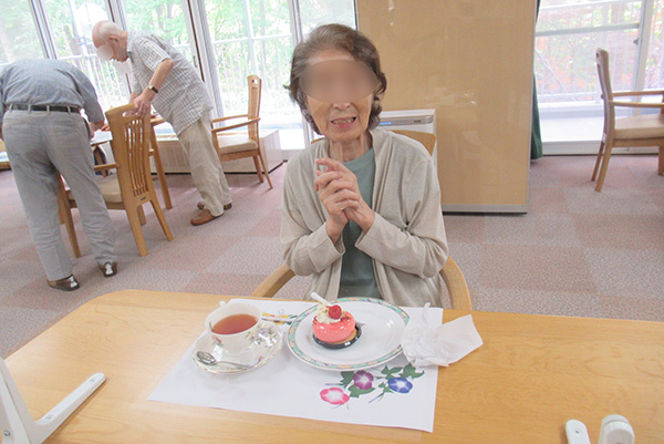 | 今月は、パティスリー・アカツキのケーキを準備してアイムス喫茶を行いました。 可愛いクマ、ハリネズミのケーキもあり「可愛いから何処からたべようか」と迷われている方 定番のイチゴショート、モンブラン、季節のケーキを食べて 今日のケーキは軽くて食べやすくて美味しいと笑顔で話され、入居者同士の会話も弾み 楽しい時間を過ごされていました。 |