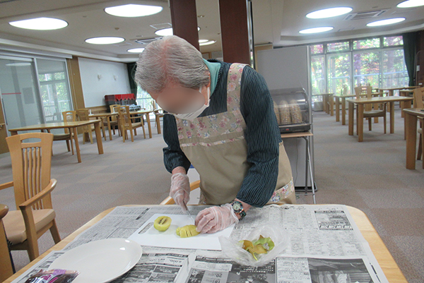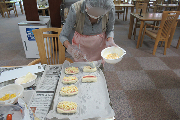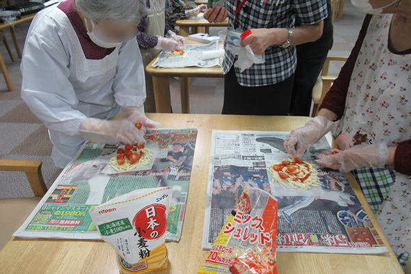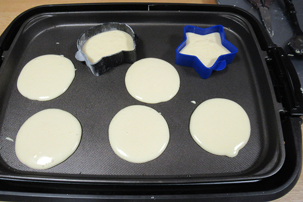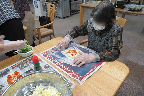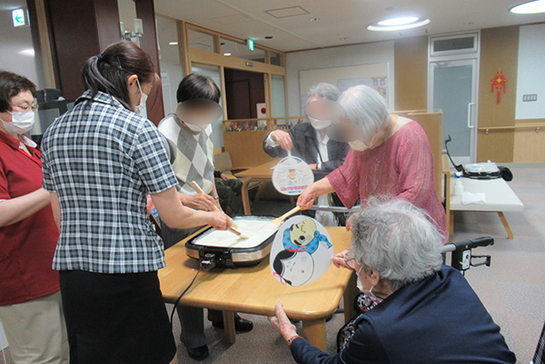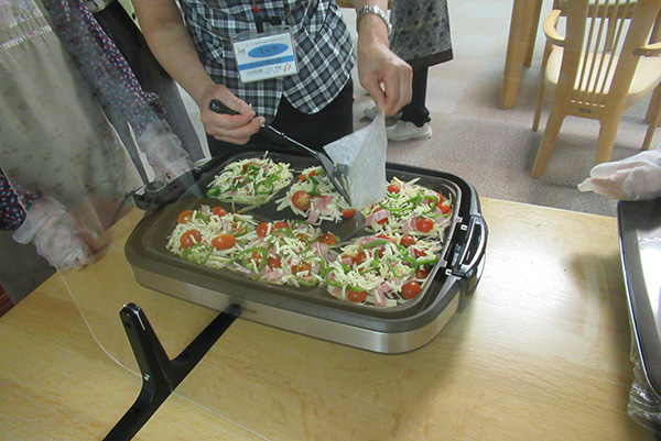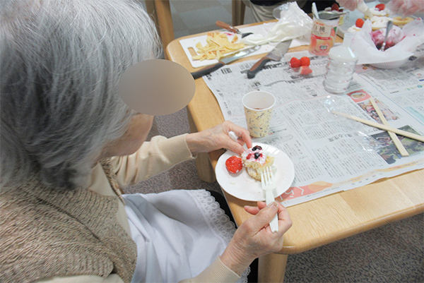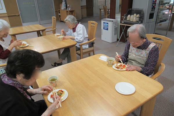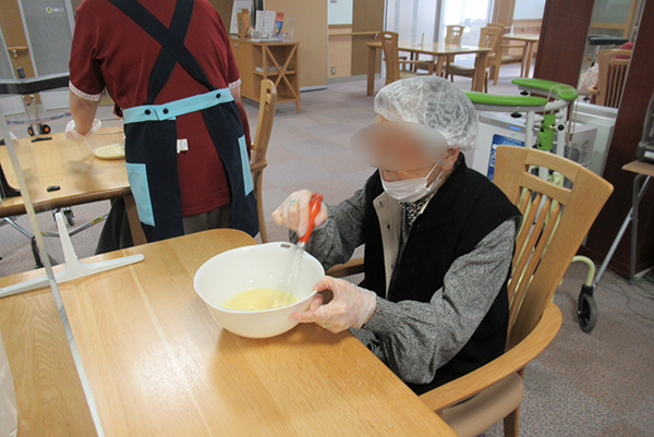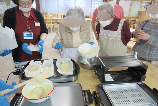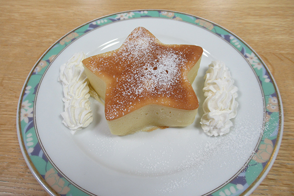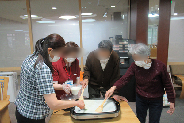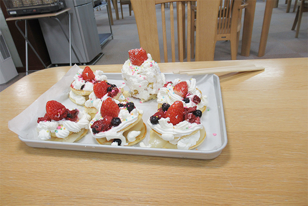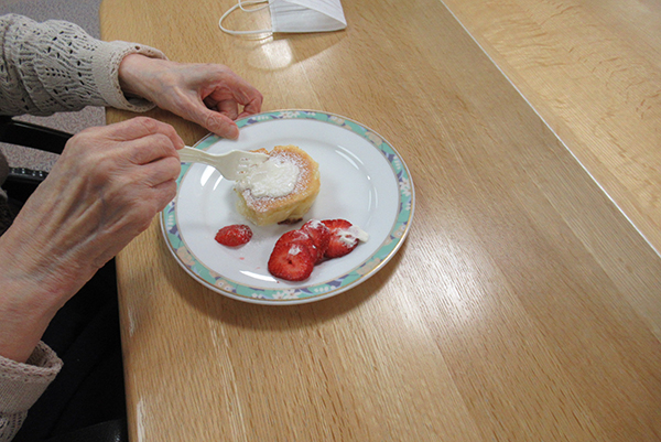 | 今月は「ふわふわパンケーキ」を作って見ました。 皆さんで協力して作ったケーキのたねを、ホットプレートで焼き上げました。 カットしたイチゴやホイップクリーム、チョコソースで可愛くトッピングして みんなでおいしくいただきました。 お部屋で料理をする機会が少ないせいか、笑顔で楽しそうに調理をされ 「今日は美味しかった」と話されていました。 |