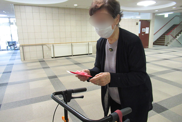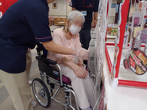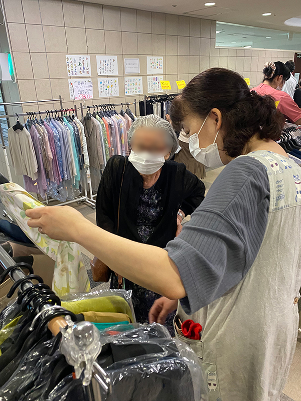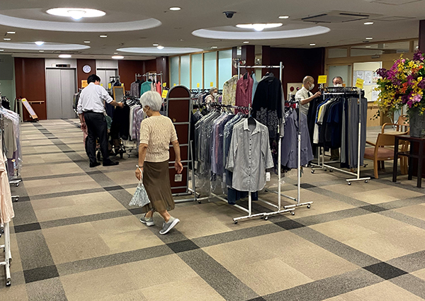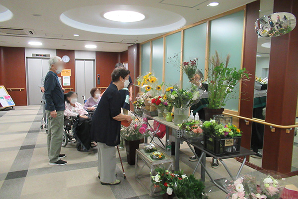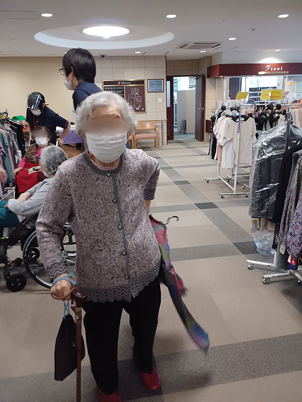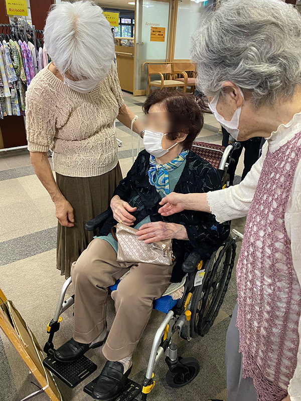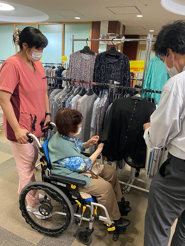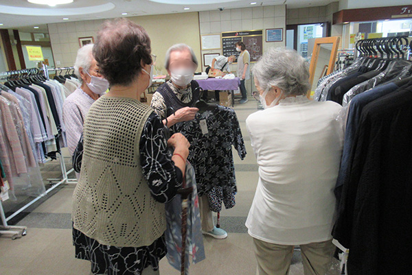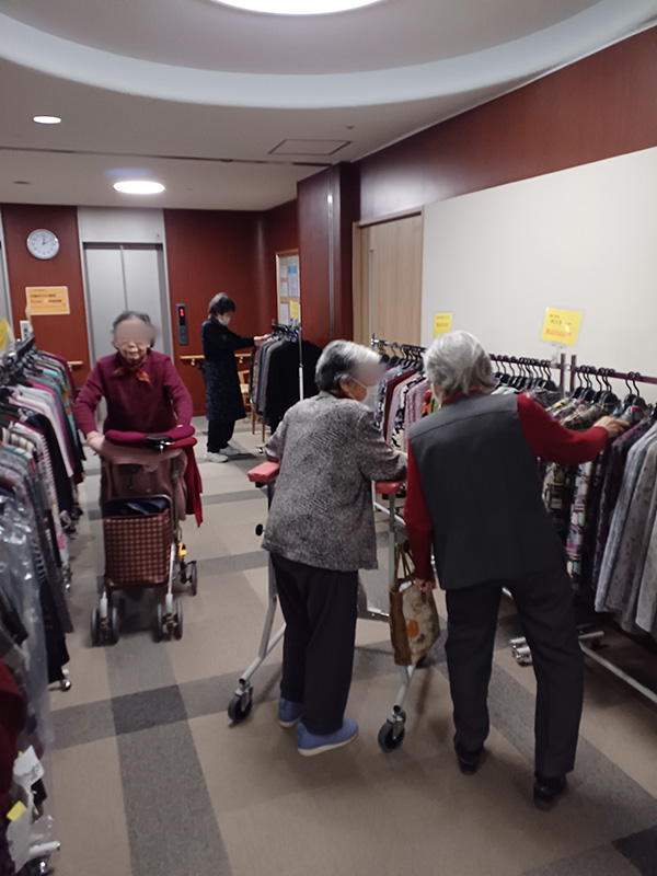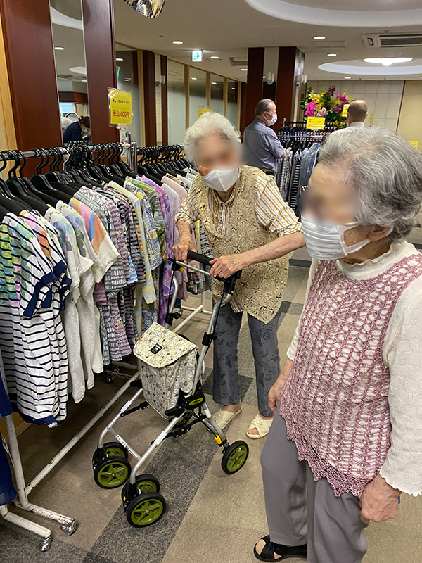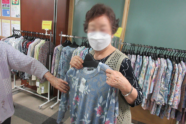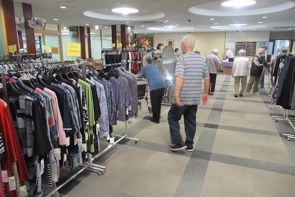 | 今日は2ヶ月に一度の洋服販売、「さいじょう」さんに来ていただきました。 売り場では鮮やかな花柄が目立っていましたが来店された入居者様は「派手ねぇ」といいながらシックなカラーや淡い柄など落ち着いた印象の洋服を探していました。 とはいえせっかく買うならと赤い差し色の入ったものや、一部透けるような上着などこだわりのオシャレが見られました。 |