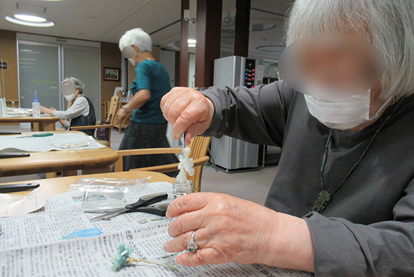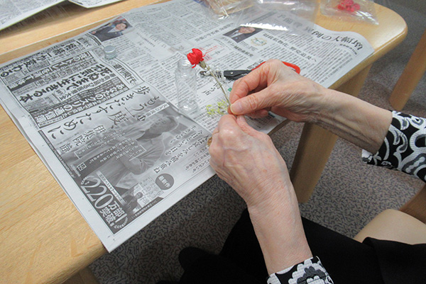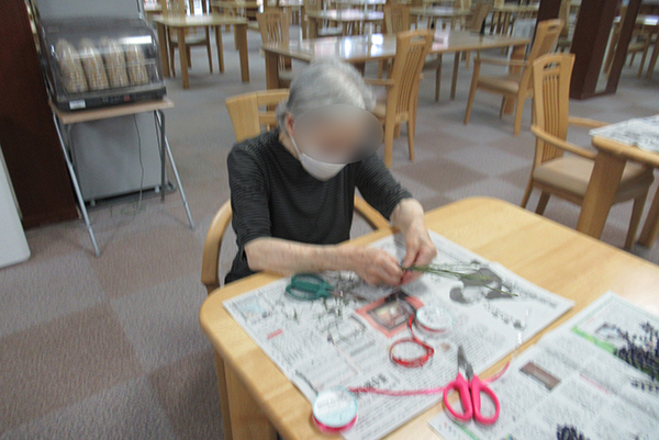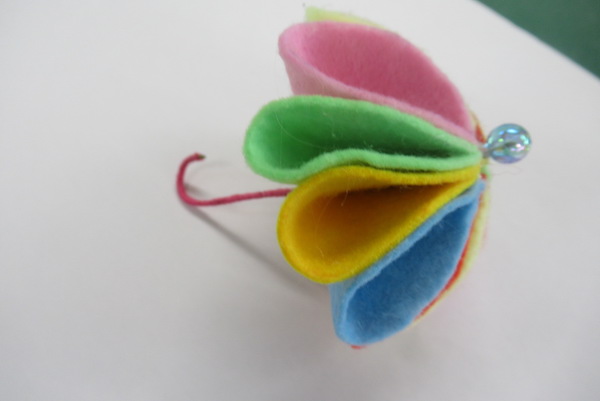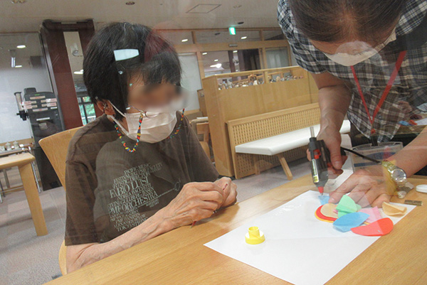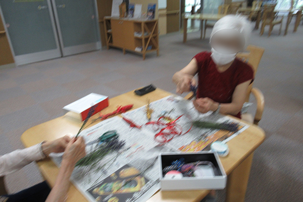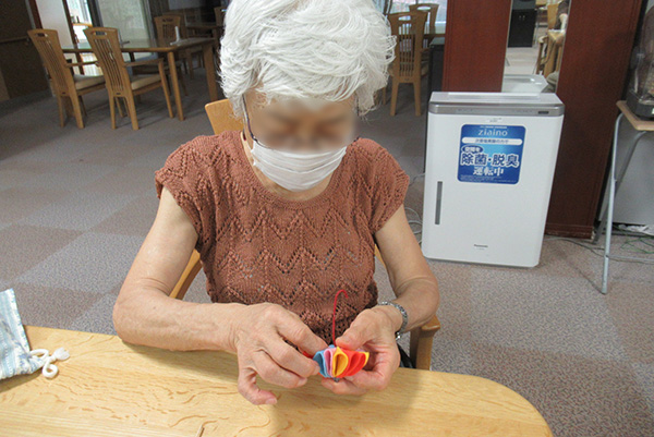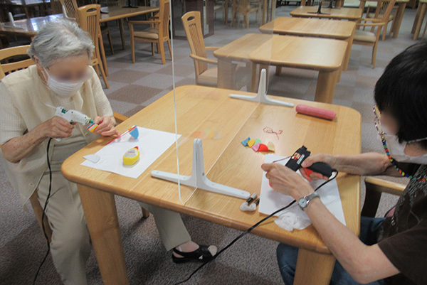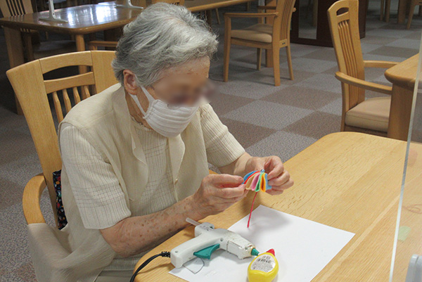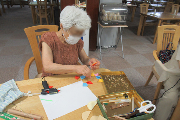 | 今日はフェルトで作るパラソルのマスコットを作りました。 フェルトを型通りにカットしてグルーガンで傘の形を作ります。 ワイヤーにテープを巻いて持ち手を作る細かな作業が多かったので大変だったようです。 仕上がりを見ると「かわいい作ってよかった」と話されていました。 |