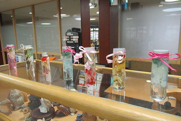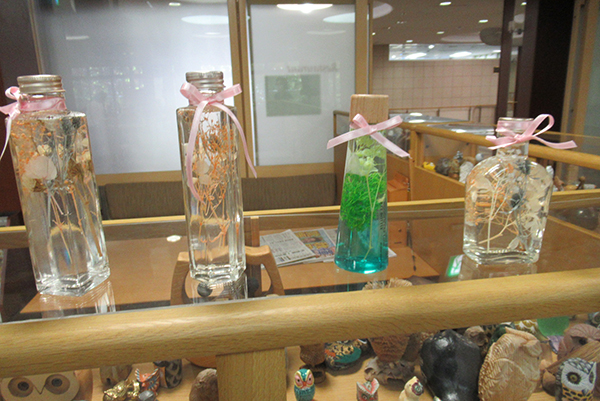 | 先月のイベントが大好評につき2回目の開催です。 前回よりすこし大き目のものに挑戦しました。 色が付いた素材を使うと中の液が色づいていきます、前回色が濃くなってしまったことも踏まえて スッキリした色の素材でまとめてみました。 |