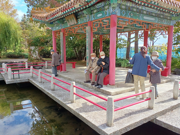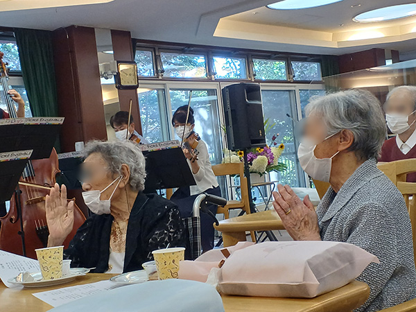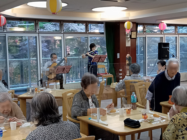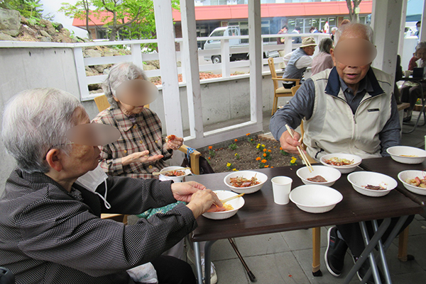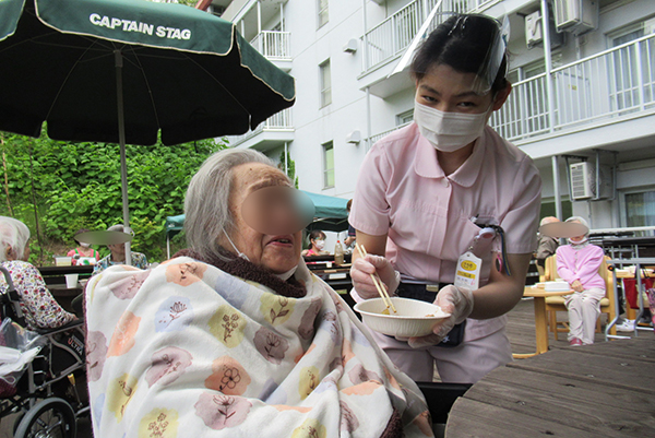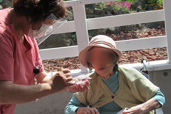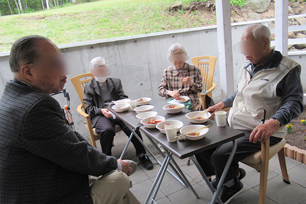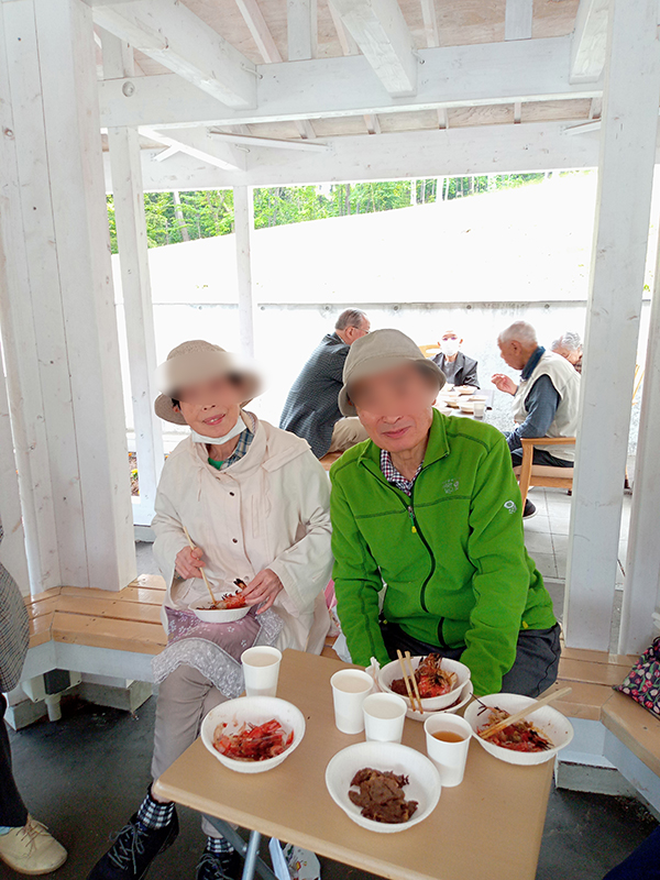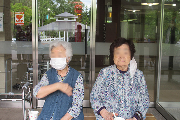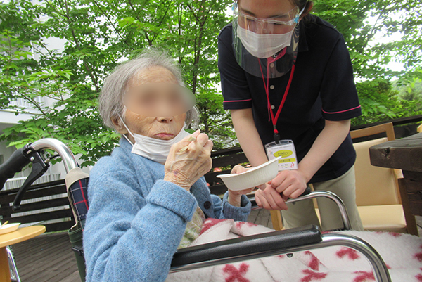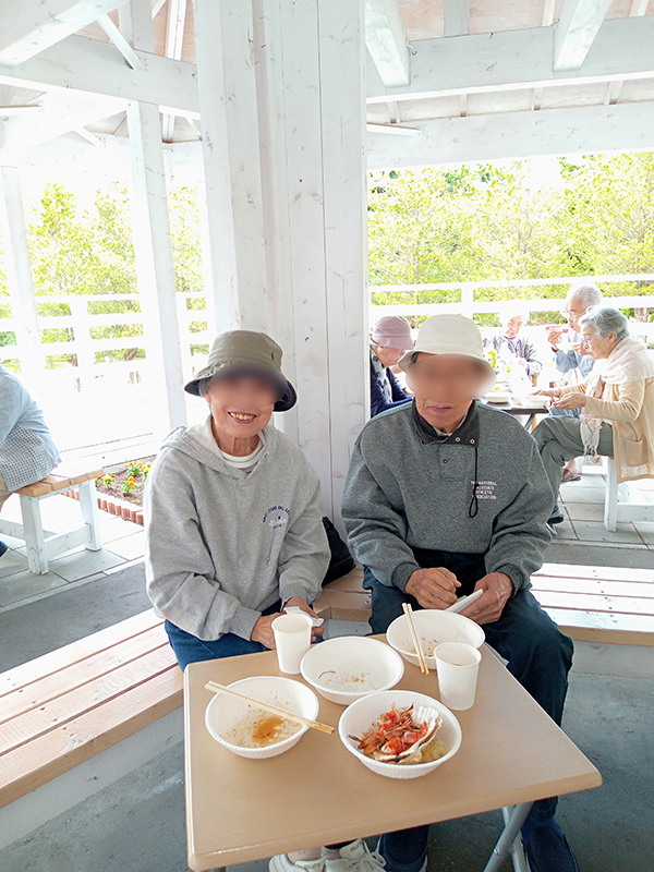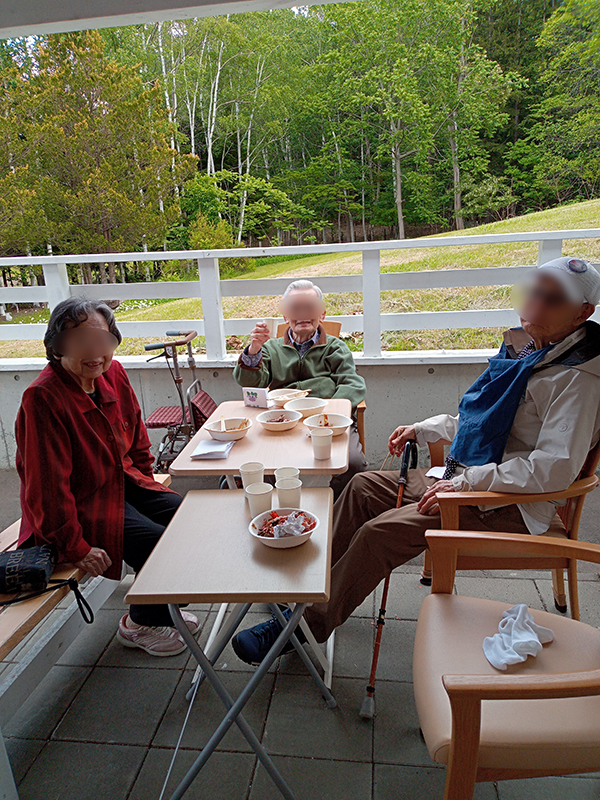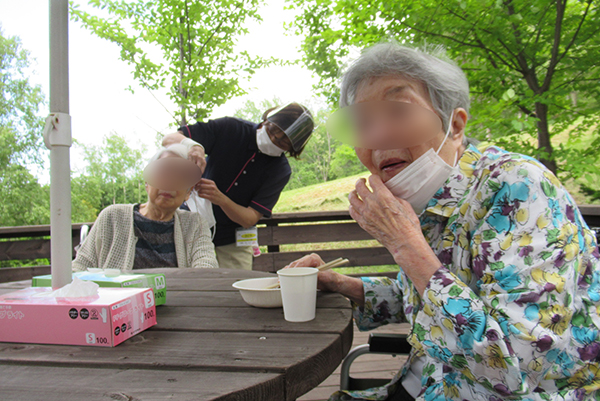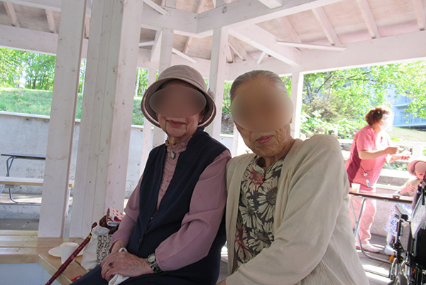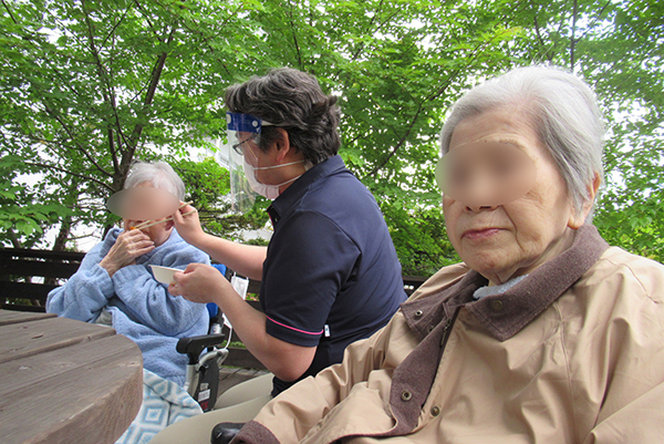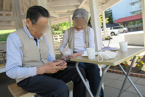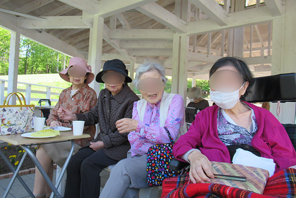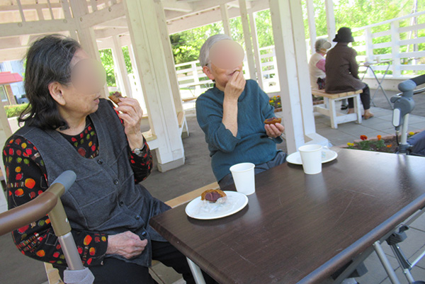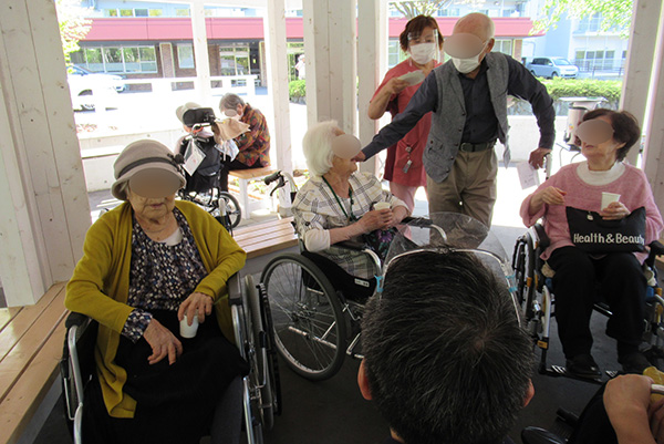 | 今日は気持ちの良い青空が広がり、以前から計画していたお茶会を実施いたしました。 アイムスの敷地にある東屋でお茶と和菓子のおもてなし。 あたたかな陽光と夏に向かう春風の中、お茶しながらのご歓談を楽しまれました。 集まってお話することが難しい今、楽しく話せる喜びはひとしお大きく大勢の入居者様にご参加いただきました。 |