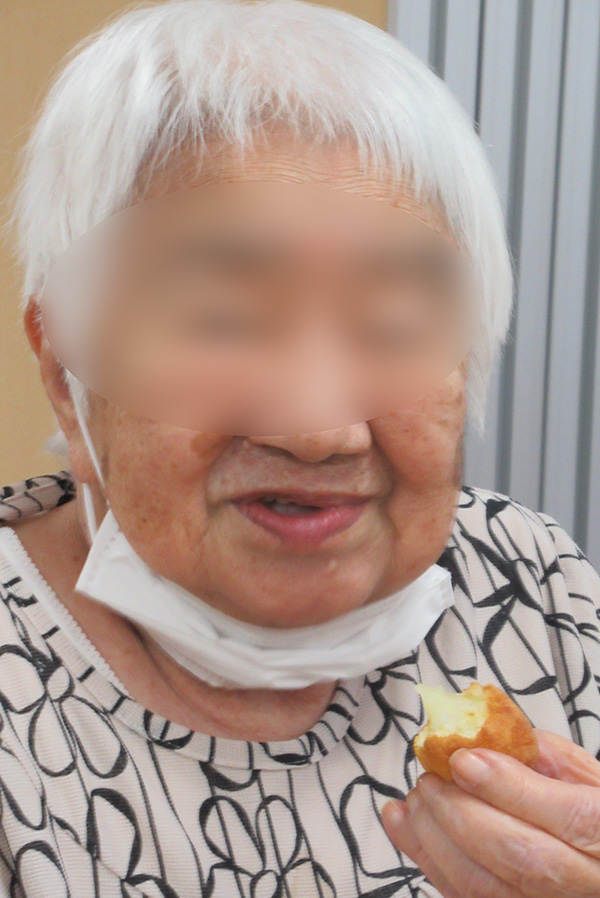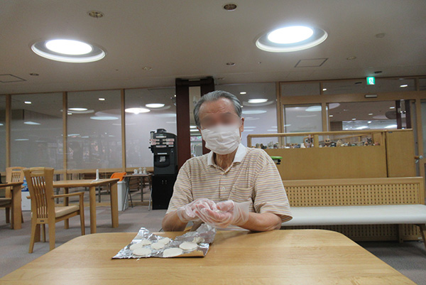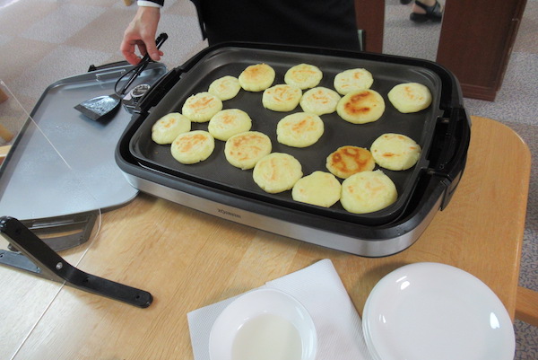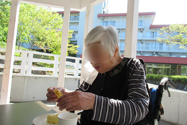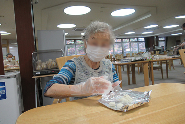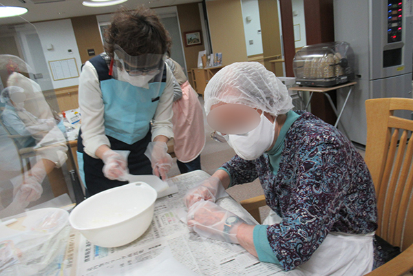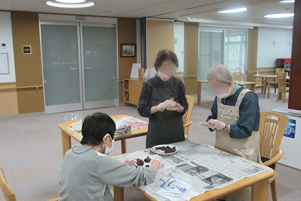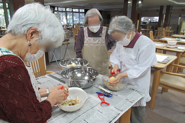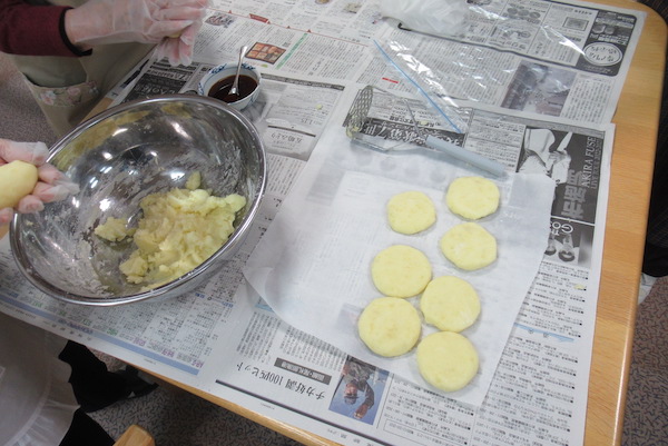 | 今月は、アイムスで収穫したジャガイモで北海道の郷土料理「いも餅」を作りました。 茹でたジャガイモを潰して片栗粉を混ぜて焼けば出来上がりです。 お家でも作っていた入居者の方々は手慣れたもので皮を剥いて、潰してと手際が良くあっという間に出来ました。 色よく焼けた「いも餅」には甘い醤油ダレがよく合います。「自分たちで作った物は格別に美味しい」と話されていました。 |