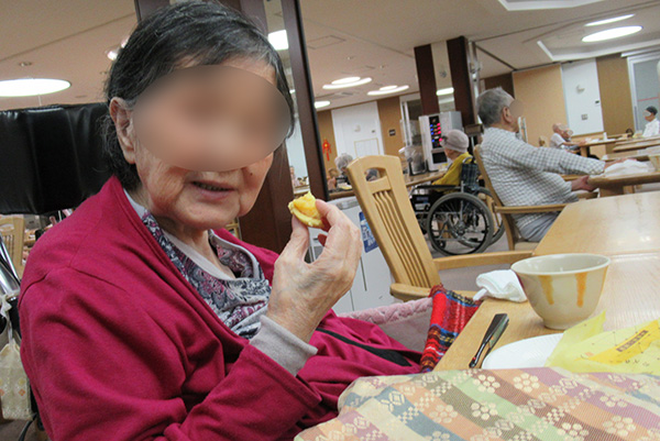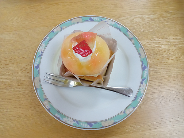 | 今回買ってきたのはパールモンドールの期間限定「まるごとピーチパイ」! パイ生地にドンとのった大振りの桃はインパクト大で皆さん目を丸くしていました。 種をくり抜いた穴にクリームをたっぷり詰めた完熟の実はとても食べやすく美味しかったと大絶賛でした。 喫茶が終わったあとも入居者同士での話題になったらしく参加されなかった方も 「話に聞いただけでも美味しそうだったから今度は来たい」と話されていました。 |