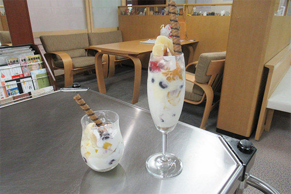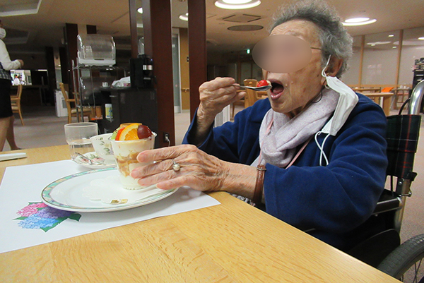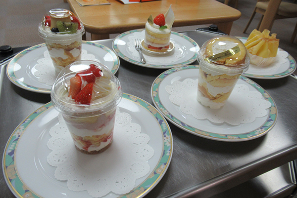 | 本日は堂島ロールで有名なモンシェールより、かわいいカップパフェ他をご用意しました。 甘酸っぱいベリーパフェやプリンとカラフルなフルーツ。 有名なロールケーキが上に乗っかったパフェもあり皆さん迷いながら選ばれました。 ロールケーキは入居者の方にも好評でクリームも重くなく「さらっと食べられていいね」と感想をいただきました。 フルーツを口にしてほころぶ顔も見られ皆さんご満足の様子でした。 |