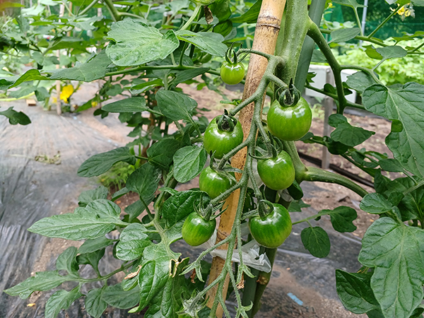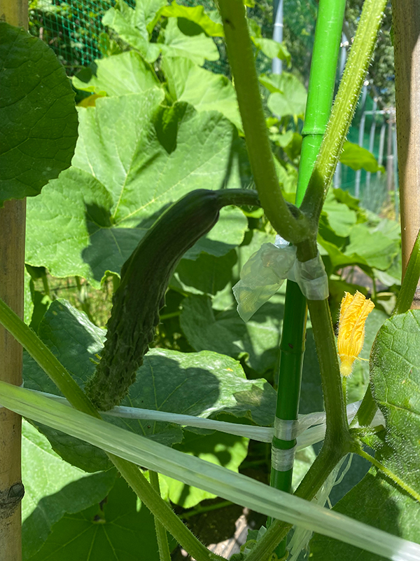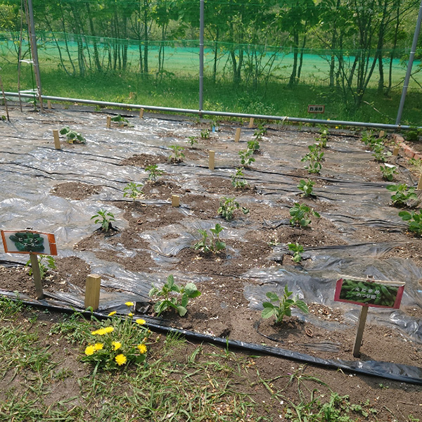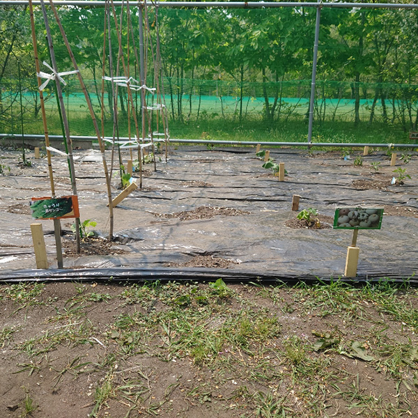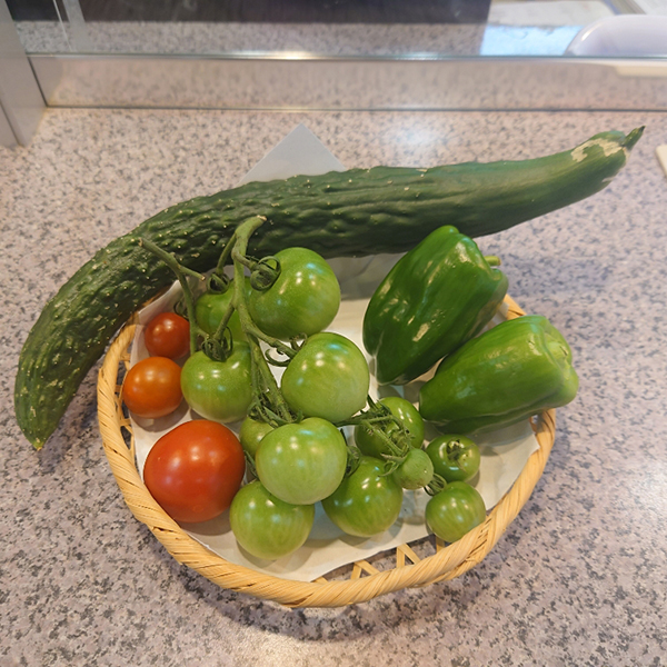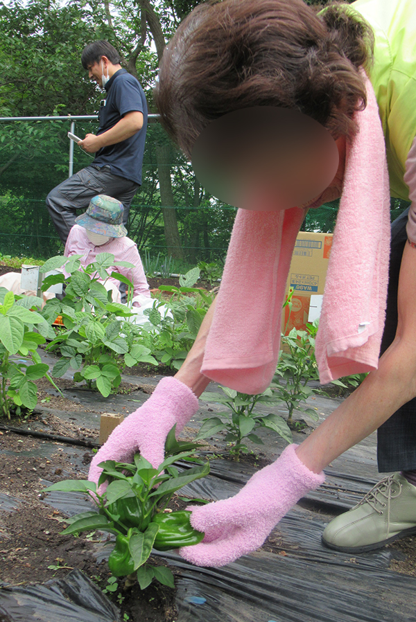 | 今週の園芸サークルは、農園の草取りをしました。 小さなカボチャ、キュウリも出来始めトマトも次回は収穫が出来ると思います。 前日まで雨が降っていたので、雑草も根が張り、育っていて 気温も高く大変でしたがピーマンの収穫が出来て皆さんは笑顔でした。 農園の近くに花がたくさん落ちているけど何の花?と入居者に言われ 確認すると夏ツバキでした。大きく白い花で散歩に出る皆さんの目を引いています。 |