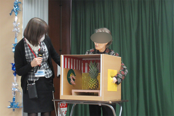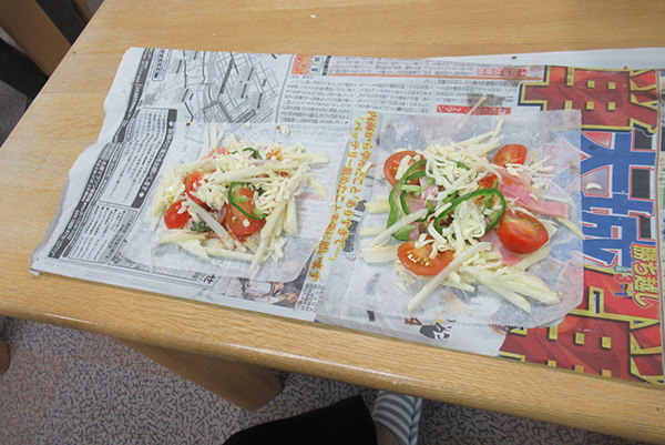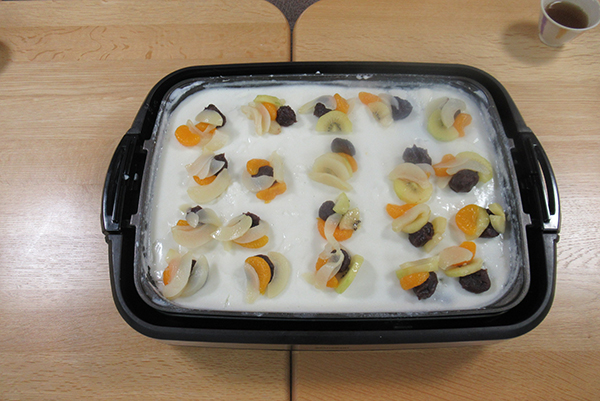 | 「フルーツ牛乳寒天」をホットプレートで作ってみました。 ホットプレートで作れるのか少し心配していましたが上手に美味しく出来上がりました。 冷ますのにうちわで一生懸命に仰いでくれたり、みんなでカットしたフルーツを トッピングして、楽しみながら参加してくれました。 |