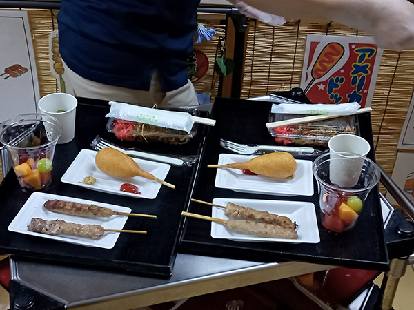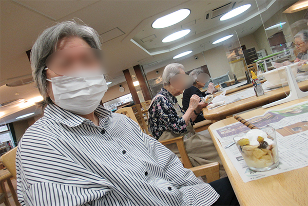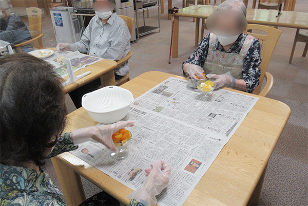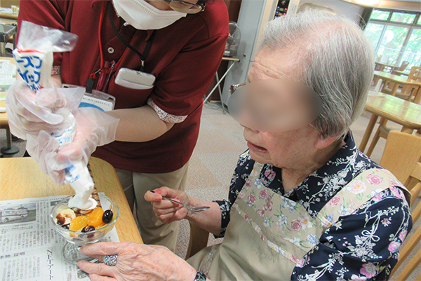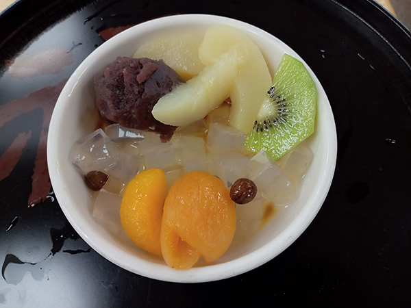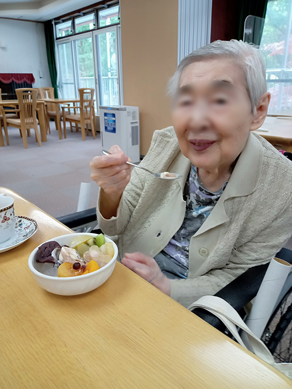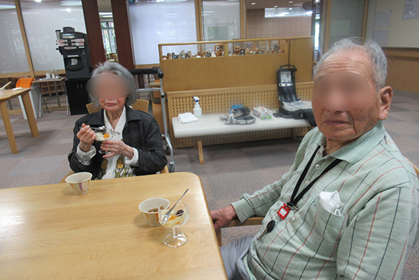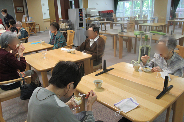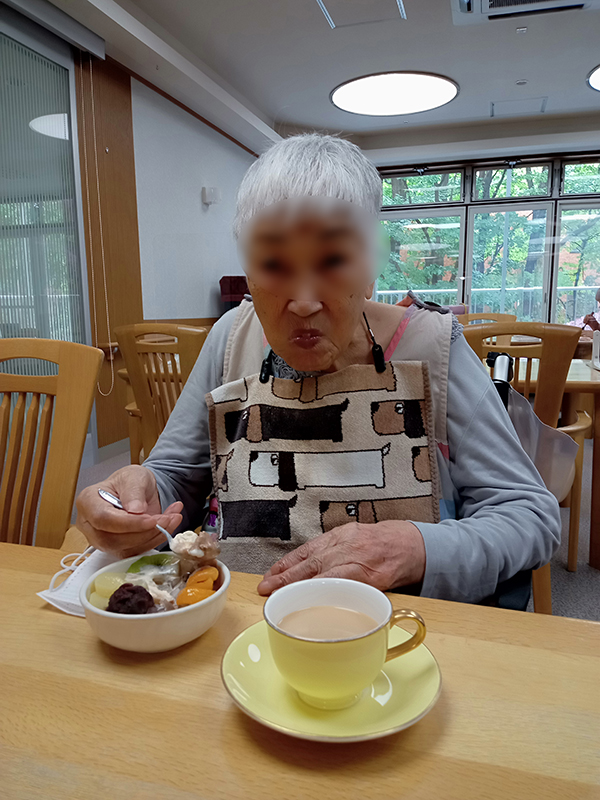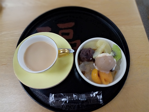 | 今月は「クリームあんみつ」 円山の甘味処「さきの」のあんみつを買って来てアイスクリームやフルーツをトッピングして提供しました。 暑い日が増えてきたのでクリームあんみつが食べたいと要望もあり今回の喫茶メニューにいたしました。 夏にピッタリのひんやり和スイーツ、皆さん美味しそうに食べられていました。 |