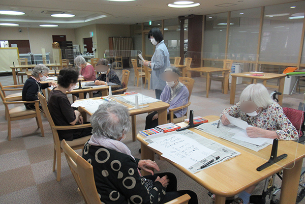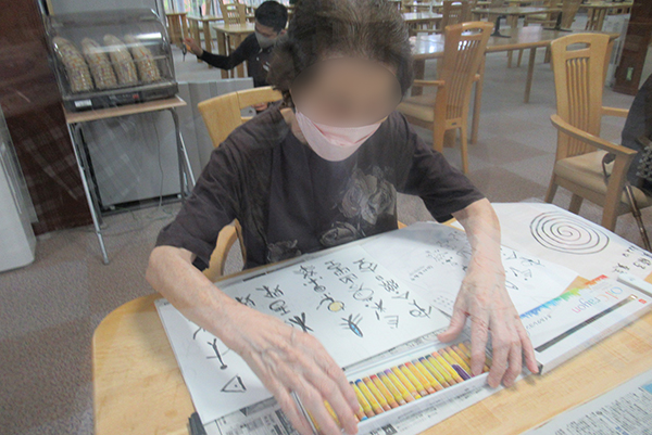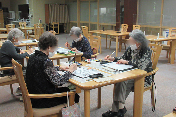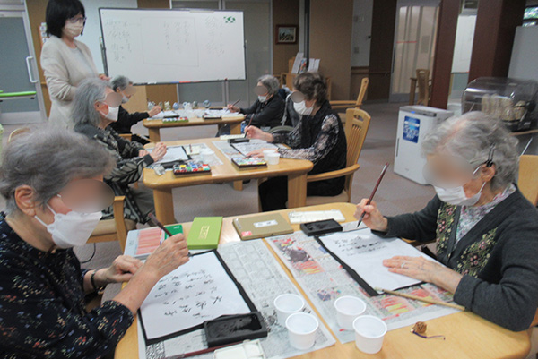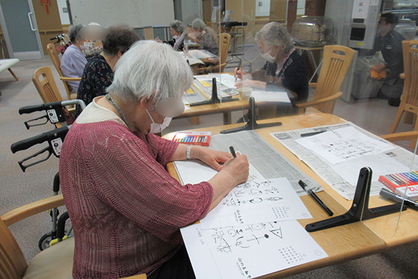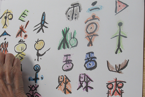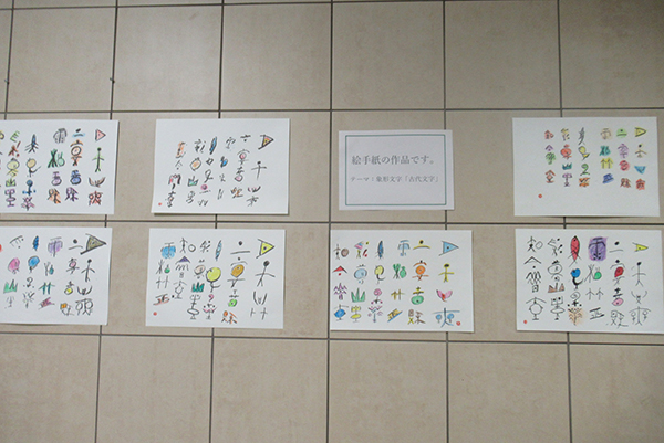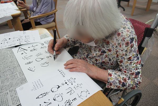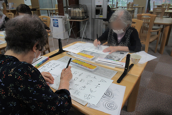 | 「テーマ 象形文字、古代文字」 古代文字は難しいのではと講師の先生も心配されていましたが 皆さん集中されて上手に書いていました。 作品はロビーに展示して他の入居者さんにも見て頂いています。 |