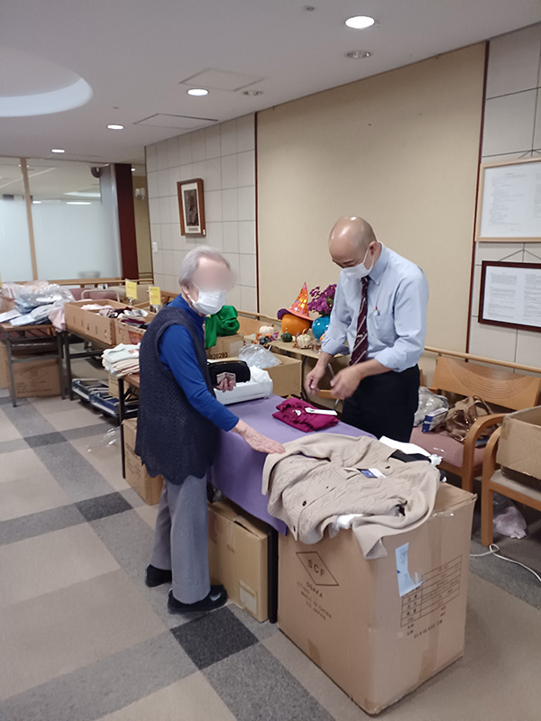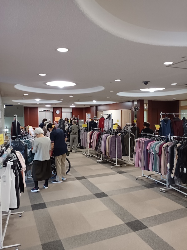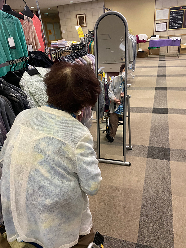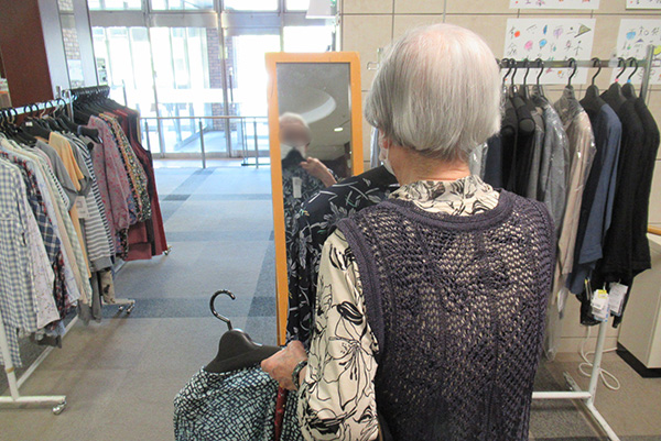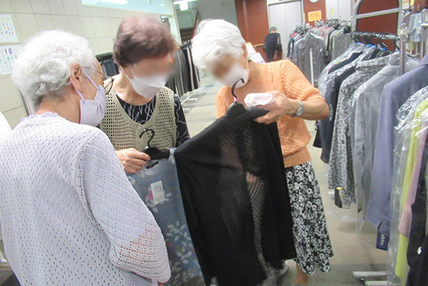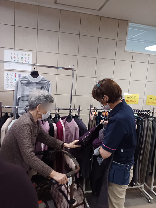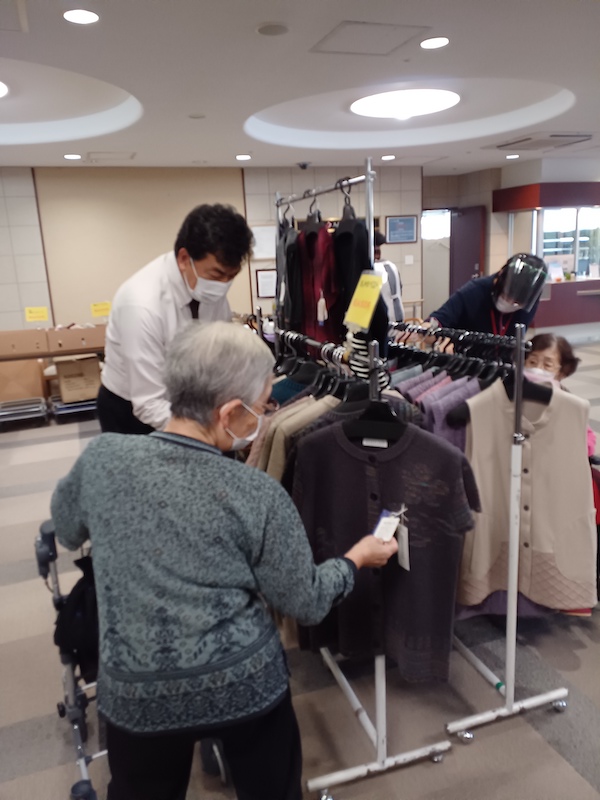 | 本日は洋服の販売店「さいじょう」をお呼びし、利用者の皆様にショッピングを楽しんでいただきました。 そろそろ冬に向かって寒くなりはじめ、季節の変わり目ということで長袖やカーデガンが勢ぞろい。 たくさんある中からいくつか選び、試着をしてから職員と相談したりして購入を検討されておりました。 |