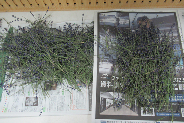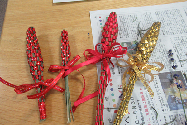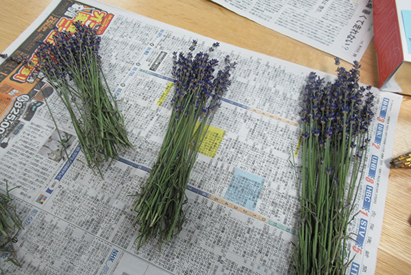 | 今回はちょっと難しいものに挑戦!ラベンダースティックを作りました。 乾燥させたラベンダーを折り曲げて、茎で穂先を包み花がこぼれない様にリボンで編んでいきます。 手元で色々な事をこなさなければならないので皆さん大苦戦! なんとかかんとか完成したスティックの香りを楽しんで一息つきました。 |