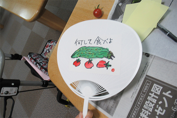 | 今日はうちわの絵をかきました。モデルはアイムスの農園で採れたトマトやきゅうり等の夏野菜。 風で折れてしまった鈴生りのまだ食べられない青い実も、絵なら十分楽しめます。 描いた野菜をうちわに貼り付けて他には無いこの夏だけのオリジナルうちわが完成しました。 |