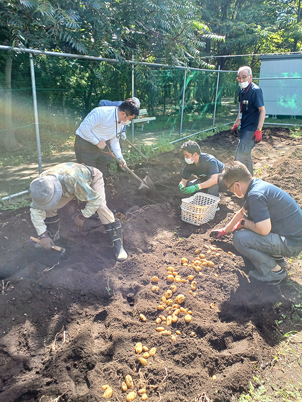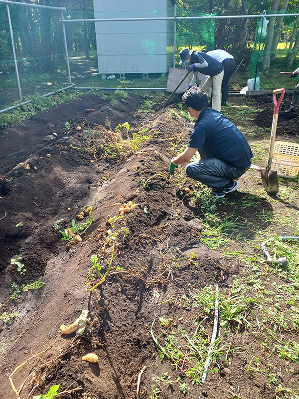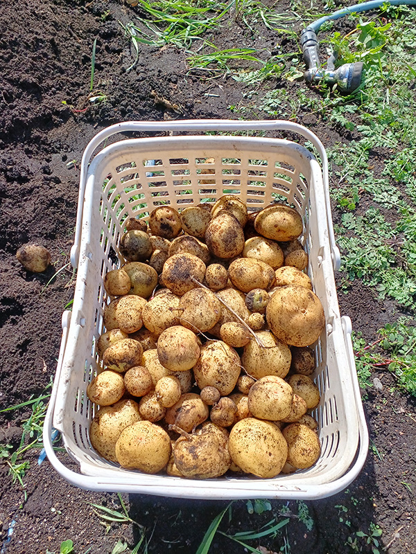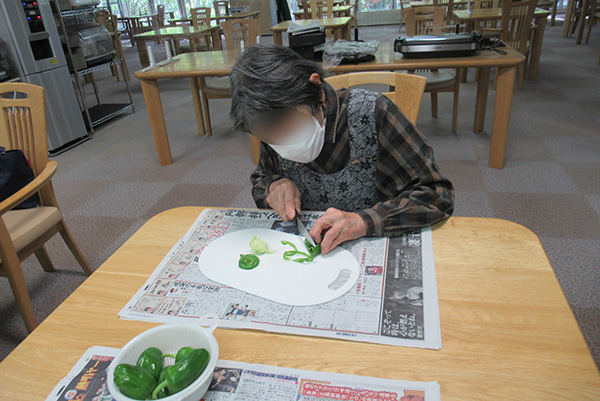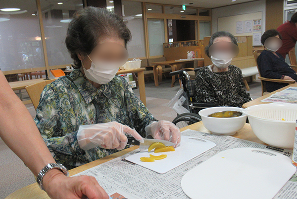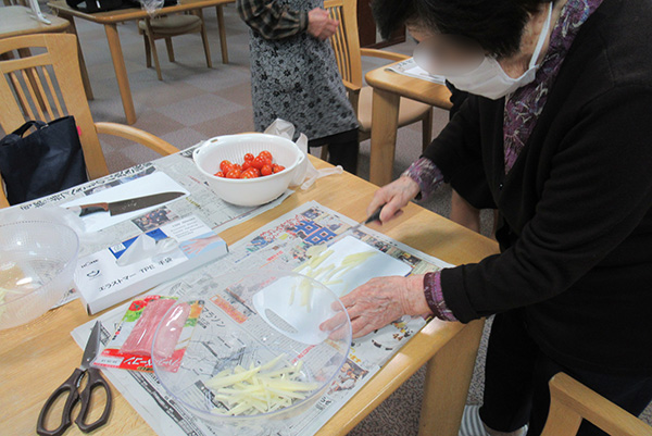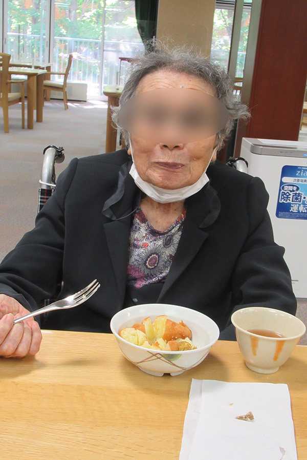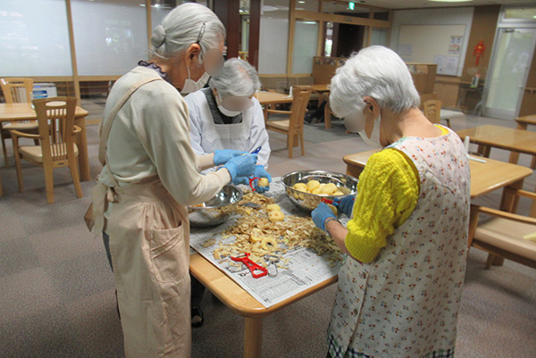 | 今日は待ちに待った収穫祭!アイムス農園でとれたジャガイモの出番です!(昨日も少し使いました) まずは下ごしらえ、準備にあつまっていただいた入居者様に皮を剥くのを手伝っていただきます。 今回のメニューは揚げ芋とフライドポテト! ホットケーキ生地で包んだ小芋と短冊に切ったポテトを揚げてみんなで食べました。 お好みでお砂糖とケチャップを付けて「こんな食べ方もあるのね!」と喜んで食べられていました。 |