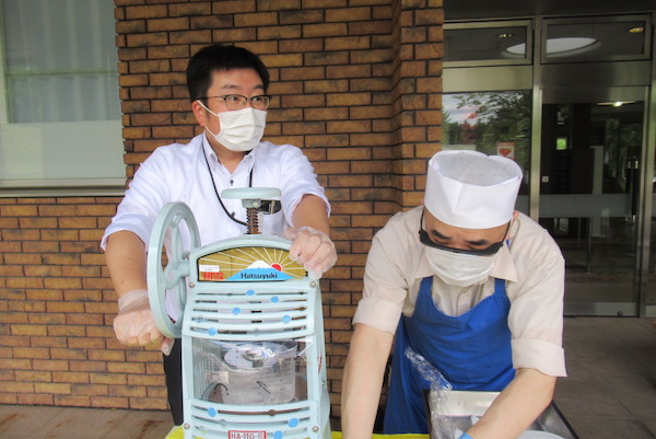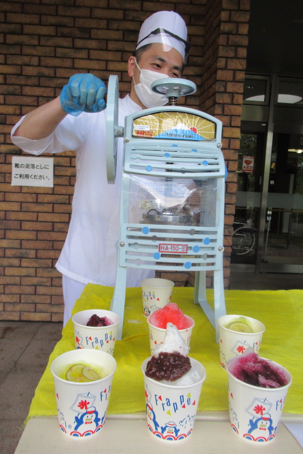 | 暑気払いにかき氷を提供いたしました。 今回は定番のイチゴシロップ、和風な甘さのあずき練乳、シェフ特性ブルーベリーソース、ほのかな苦みのレモン味をご用意。 暑さの中だとクーラーの効いた部屋で過ごしたくもなりますが、出来立ての氷菓があれば人との会話も弾みます。 外に出られる方、レストランで過ごされる方、気の合う仲間とそれぞれ楽しまれていました。 |