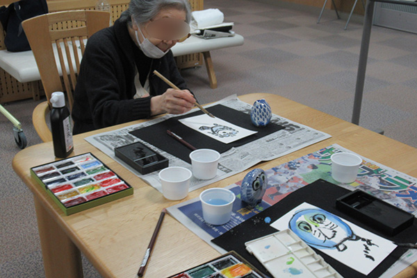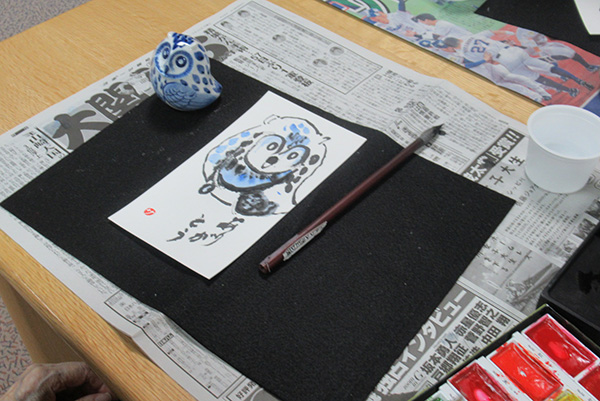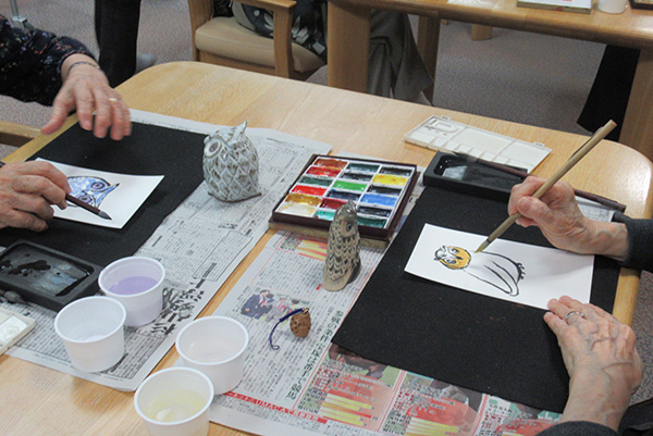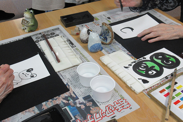 | 本日は先生をお招きして動物の置物をモデルに絵をかいてみました。 とはいっても置物そっくりに描くわけではありません。 紙に筆で動物を描いてくださいと言われても難しいもの、 置物を見ながら描くことで「こういうのでいいんだ!」と気楽に描くことが出来ます。 皆さんも楽しく筆を動かしながら温かな味のある動物たちを愛嬌たっぷりに描いてくれました。 |
