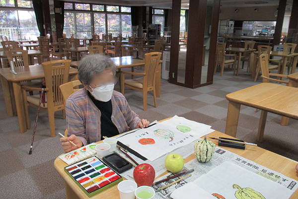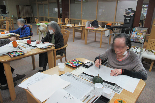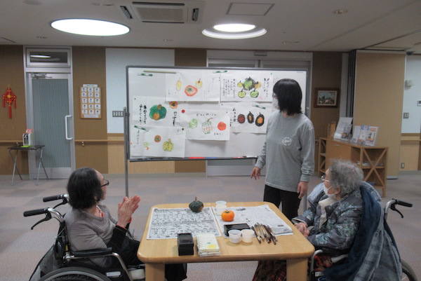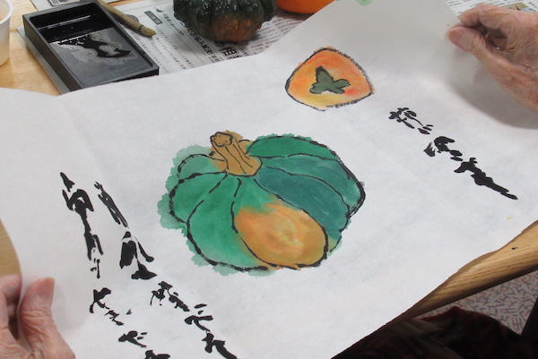 | 本日の絵手紙教室のテーマは「秋の野菜、果物」。 今回は、大きめの和紙にご自身で選んだ野菜、果物を描いていただきました。 果物を選び描いているうちに「食べたくなってきた」と話される方観賞用のおもちゃカボチャを選んだ方は、細かな筋、凸凹も丁寧に書き上げていました 絵の横には季節感たっぷりの童謡も添えて秋の手紙が描けました。 |